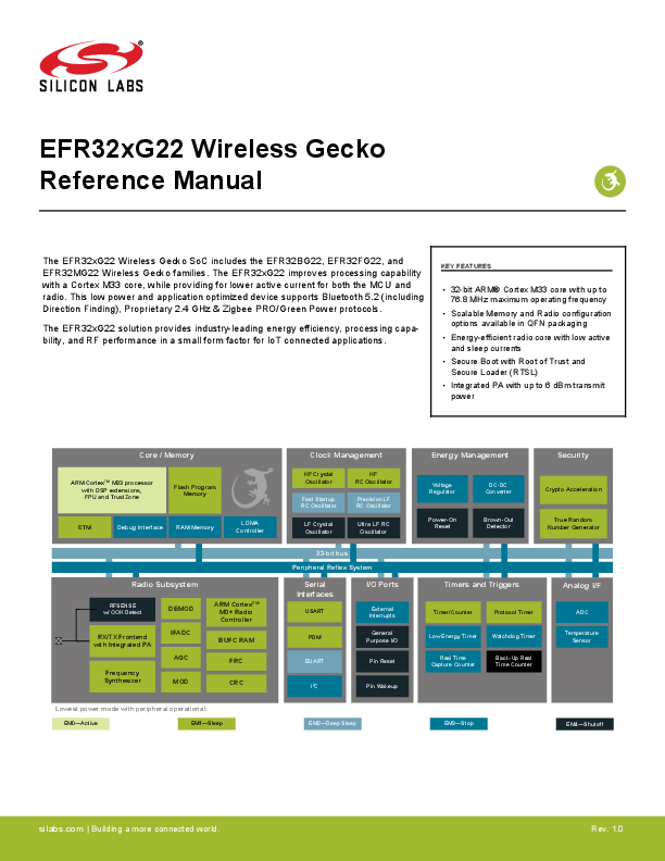 EFM32PG22 Gecko MCU Family Data Sheet Silicon Labs EFM32PG22 Gecko MCU family data sheet detailing features, specifications, and ordering information for this 32-bit ARM Cortex-M33 microcontroller, ideal for energy-friendly embedded applications in consumer and industrial markets. |
