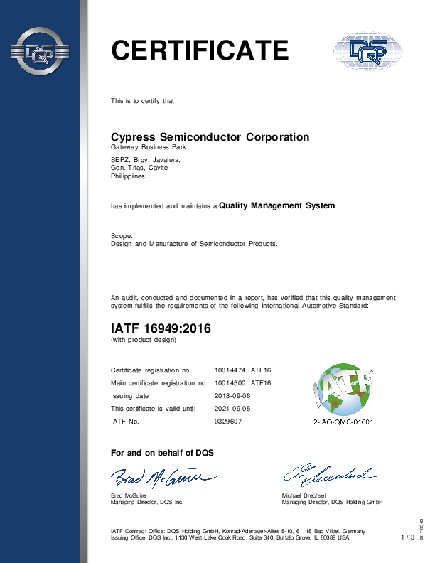 CERTIFICATE This is to certify that Cypress Semiconductor Corporation Gateway Business Park SEPZ, Brgy. Javalera, Gen. Trias, Cavite Philippines has implemented and maintains a Quality Management System. Scope: Design and Manufacture of Semiconductor Products. An audit, conducted and documented in a report, has verified that this quality management system fulfills the requirements of the following International Automotive Standard: IATF 16949:2016 (with product design) Certificate registration no. 10014474 IATF16 Main certificate registration no. 10014500 IATF16 Issuing date 2018-09-06 This certificate is valid until 2021-09-05 IATF No. 0329607 For and on behalf of DQS Brad McGuire Managing Director, DQS Inc. Michael Drechsel Managing Director, DQS Holding GmbH IATF Contract Office: DQS Holding GmbH, Konrad-Adenauer-Allee 8-10, 61118 Bad Vilbel, Germany Issuing Office: DQS Inc., 1130 West Lake Cook Road, Suite 340, Buffalo Grove, IL 60089 USA 1 / 3 2017-03-09 Annex to certificate registration no.: 10014474 IATF16 IATF-No.: 0329607 Cypress Semiconductor Corporation Gateway Business Park SEPZ, Brgy. Javalera, Gen. Trias, Cavite Philippines Remote Location Scope 10003529 Cypress Semiconductor Corporation Sdn. Bhd. (613545-T), Phase II Free Industrial Zone Bayan Lepas 11900 Penang Malaysia Contract Review and Customer Service. 10003530 Cypress Semiconductor Corporation 229 Moo 4 Changwattana Road Pakkred, Nonthaburi, 11120 Thailand Supplier Management. 10005102 Cypress Semiconductor Corporation Cube Kawasaki, 1-14, Nisshin-cho Kawasaki-ku, Kawasaki-shi 210-0024 Kanagawa Japan 10013750 Cypress Semiconductor Corporation KSP R&D A/B 8F, 3-2-1 Sakado,Takatsu-ku, Kawaski-shi, Kanagawa, 213-0012 Japan 10014477 Cypress Semiconductor Corporation 2700 162nd Street SW, Building D Lynnwood, WA 98087 United States of America Customer Service. Engineering and Supplier Management. Laboratory and Product Design. 10014479 Cypress Semiconductor Corporation #65/2, Bagmane Tech Park, Block C, Bagmane Laurel, CV Raman Nagar, Bangalore, Karnataka 560 093 India Customer Service, Engineering, Information Technology, Laboratory, Marketing, and Training. 10014481 Cypress Semiconductor Corporation 1850 Cypress Semi Dr. Colorado Springs, CO 80921 United States of America Laboratory, Marketing, and Product Design. This annex (edition: 2018-09-06) is only valid in connection with the above-mentioned certificate. 2 / 3 2017-03-09 Annex to certificate registration no.: 10014474 IATF16 IATF-No.: 0329607 Cypress Semiconductor Corporation Gateway Business Park SEPZ, Brgy. Javalera, Gen. Trias, Cavite Philippines Remote Location Scope 10014496 Cypress Semiconductor Corporation Internal Audit Management. KDX Musashi Kosugi Bldg. 3-1200 Shinmaruko Higashi Nakahara-ku, Kawasaki-shi, Kanagawa, 211-0004 Japan 10014497 Cypress Semiconductor Corporation Willy-Brandt-Allee 4 81829 Munich Germany Customer Service and Engineering. 10014500 Cypress Semiconductor Corporation 198 Champion Court San Jose, CA 95134 United States of America Customer Service, Engineering, Laboratory, Logistics, Management Review, Policy Making, Quality System Management, Strategic Planning, Supplier Management, and Warranty Management. 10015800 Cypress Semiconductor Corporation Luhanska St., 20 Lviv 79034 Ukraine Engineering. 2017-03-09 This annex (edition: 2018-09-06) is only valid in connection with the above-mentioned certificate. 3 / 3pdfFactory Pro www factory.com pdfFactory Pro 4.50 (Windows 7 Ultimate x64)