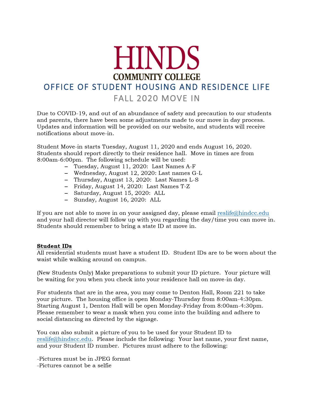 If you are not able to move in on your assigned day, please email reslife@hindcc.edu and your hall director will follow up with you regarding the day/time you can move in. Students should remember to bring a state ID at move in.