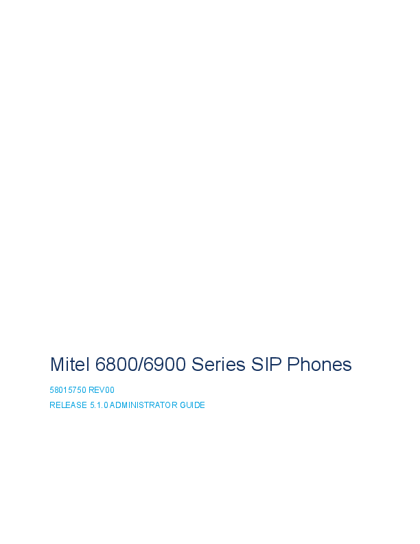 Mitel 6800/6900 Series SIP Phones 58015750 REV00 RELEASE 5.1.0 ADMINISTRATOR GUIDE NOTICE The information contained in this document is believed to be accurate in all respects but is not warranted by Mitel NetworksTM Corporation (MITEL®). The information is subject to change without notice and should not be construed in any way as a commitment by Mitel or any of its affiliates or subsidiaries. Mitel and its affiliates and subsidiaries assume no responsibility for any errors or omissions in this document. Revisions of this document or new editions of it may be issued to incorporate such changes. No part of this document can be reproduced or transmitted in any form or by any means - electronic or mechanical - for any purpose without written permission from Mitel Networks Corporation. Trademarks The trademarks, service marks, logos and graphics (collectively "Trademarks") appearing on Mitel's Internet sites or in its publications are registered and unregistered trademarks of Mitel Networks Corporation (MNC) or its subsidiaries (collectively "Mitel") or others. Use of the Trademarks is prohibited without the express consent from Mitel. Please contact our legal department at legal@mitel.com for additional information. For a list of the worldwide Mitel Networks Corporation registered trademarks, please refer to the website: http://www.mitel.com/trademarks. Mitel 6800/6900 Series SIP Phones Release 5.1.0 Administrator Guide 58015750 REV00 - October 2018 ®,TM Trademark of Mitel Networks Corporation © Copyrights 2018, Mitel Networks Corporation All rights reserved Table of Contents Preface . . . . . . . . . . . . . . . . . . . . . . . . . . . . . . . . . . . . . . . . . . . . . . . . . . . . . . . . . . . . . . . . . . . . . -20 What's New . . . . . . . . . . . . . . . . . . . . . . . . . . . . . . . . . . . . . . . . . . . . . . . . . . . . . . . . . . . . . . . -20 Audience . . . . . . . . . . . . . . . . . . . . . . . . . . . . . . . . . . . . . . . . . . . . . . . . . . . . . . . . . . . . . . . . . -21 Documentation . . . . . . . . . . . . . . . . . . . . . . . . . . . . . . . . . . . . . . . . . . . . . . . . . . . . . . . . . . . . . -21 Chapters and Appendices in this Guide . . . . . . . . . . . . . . . . . . . . . . . . . . . . . . . . . . . . . . . . . -22 CHAPTER 1: OVERVIEW About this Chapter . . . . . . . . . . . . . . . . . . . . . . . . . . . . . . . . . . . . . . . . . . . . . . . . . . . . . . . . . . . . 1-2 Topics . . . . . . . . . . . . . . . . . . . . . . . . . . . . . . . . . . . . . . . . . . . . . . . . . . . . . . . . . . . . . . . . . . . 1-2 IP Phone Models . . . . . . . . . . . . . . . . . . . . . . . . . . . . . . . . . . . . . . . . . . . . . . . . . . . . . . . . . . . . . 1-3 Description . . . . . . . . . . . . . . . . . . . . . . . . . . . . . . . . . . . . . . . . . . . . . . . . . . . . . . . . . . . . . . . . 1-3 Optional Accessories . . . . . . . . . . . . . . . . . . . . . . . . . . . . . . . . . . . . . . . . . . . . . . . . . . . . . . . . 1-5 Model 6863i IP Phone . . . . . . . . . . . . . . . . . . . . . . . . . . . . . . . . . . . . . . . . . . . . . . . . . . . . . . 1-10 Model 6865i IP Phone . . . . . . . . . . . . . . . . . . . . . . . . . . . . . . . . . . . . . . . . . . . . . . . . . . . . . . 1-12 Model 6867i IP Phone . . . . . . . . . . . . . . . . . . . . . . . . . . . . . . . . . . . . . . . . . . . . . . . . . . . . . . 1-15 Model 6869i IP Phone . . . . . . . . . . . . . . . . . . . . . . . . . . . . . . . . . . . . . . . . . . . . . . . . . . . . . . 1-18 Model 6873i IP Phone . . . . . . . . . . . . . . . . . . . . . . . . . . . . . . . . . . . . . . . . . . . . . . . . . . . . . . 1-21 Model 6920 IP Phone . . . . . . . . . . . . . . . . . . . . . . . . . . . . . . . . . . . . . . . . . . . . . . . . . . . . . . 1-23 Model 6930 IP Phone . . . . . . . . . . . . . . . . . . . . . . . . . . . . . . . . . . . . . . . . . . . . . . . . . . . . . . 1-25 Model 6940 IP Phone . . . . . . . . . . . . . . . . . . . . . . . . . . . . . . . . . . . . . . . . . . . . . . . . . . . . . . 1-27 Firmware Installation Information . . . . . . . . . . . . . . . . . . . . . . . . . . . . . . . . . . . . . . . . . . . . . . . . 1-29 Description . . . . . . . . . . . . . . . . . . . . . . . . . . . . . . . . . . . . . . . . . . . . . . . . . . . . . . . . . . . . . . . 1-29 Important M685i Expansion Module Firmware Downgrade Information . . . . . . . . . . . . . . . . 1-29 Important M695 Expansion Module Firmware Information . . . . . . . . . . . . . . . . . . . . . . . . . . 1-29 Installation Considerations . . . . . . . . . . . . . . . . . . . . . . . . . . . . . . . . . . . . . . . . . . . . . . . . . . . 1-29 Installation Requirements . . . . . . . . . . . . . . . . . . . . . . . . . . . . . . . . . . . . . . . . . . . . . . . . . . . 1-30 Configuration Server Requirement . . . . . . . . . . . . . . . . . . . . . . . . . . . . . . . . . . . . . . . . . . . . 1-31 Firmware and Configuration Files. . . . . . . . . . . . . . . . . . . . . . . . . . . . . . . . . . . . . . . . . . . . . . . . 1-32 Description . . . . . . . . . . . . . . . . . . . . . . . . . . . . . . . . . . . . . . . . . . . . . . . . . . . . . . . . . . . . . . . 1-32 Configuration File Precedence . . . . . . . . . . . . . . . . . . . . . . . . . . . . . . . . . . . . . . . . . . . . . . . 1-35 Installing the Firmware/Configuration Files . . . . . . . . . . . . . . . . . . . . . . . . . . . . . . . . . . . . . . 1-35 Multiple Configuration Server Support . . . . . . . . . . . . . . . . . . . . . . . . . . . . . . . . . . . . . . . . . . 1-36 CHAPTER 2: 3 Mitel 6800/6900 Series SIP Phone Administrator Guide CONFIGURATION INTERFACE METHODS About this Chapter . . . . . . . . . . . . . . . . . . . . . . . . . . . . . . . . . . . . . . . . . . . . . . . . . . . . . . . . . . . . 2-2 Topics . . . . . . . . . . . . . . . . . . . . . . . . . . . . . . . . . . . . . . . . . . . . . . . . . . . . . . . .