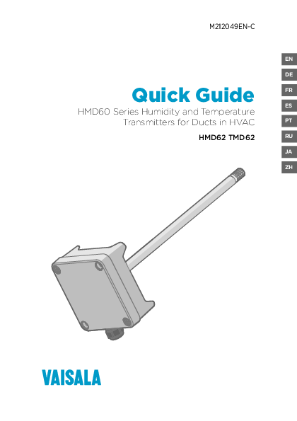 M212049EN-C EN DE Quick Guide FR HMD60 Series Humidity and Temperature ES Transmitters for Ducts in HVAC PT HMD62 TMD62 RU JA ZH PUBLISHED BY Vaisala Oyj Vanha Nurmijärventie 21, FI-01670 Vantaa, Finland P.O. Box 26, FI-00421 Helsinki, Finland +358 9 8949 1 Visit our Internet pages at www.vaisala.com. No part of this document may be reproduced, published or publicly displayed in any form or by any means, electronic or mechanical (including photocopying), nor may its contents be modified, translated, adapted, sold or disclosed to a third party without prior written permission of the copyright holder. Translated documents and translated portions of multilingual documents are based on the original English versions. In ambiguous cases, the English versions are applicable, not the translations. The contents of this document are subject to change without prior notice. Local rules and regulations may vary and they shall take precedence over the information contained in this document. Vaisala makes no representations on this document's compliance with the local rules and regulations applicable at any given time, and hereby disclaims any and all responsibilities related thereto. This document does not create any legally binding obligations for Vaisala towards customers or end users. All legally binding obligations and agreements are included exclusively in the applicable supply contract or the General Conditions of Sale and General Conditions of Service of Vaisala. This product contains software developed by Vaisala or third parties. Use of the software is governed by license terms and conditions included in the applicable supply contract or, in the absence of separate license terms and conditions, by the General License Conditions of Vaisala Group. Table of Contents English.............................................................................................................................................5 Deutsch......................................................................................................................................... 17 Français........................................................................................................................................ 29 Español.........................................................................................................................................43 Português.................................................................................................................................... 55 ........................................................................................................................................ 67 ............................................................................................................... 81 .................................................................................................................. 93 3 4 M212049EN-C ENGLISH Introduction to HMD60 Series The duct mounted HMD60 HUMICAPâ Humidity and Temperature Transmitters are designed for monitoring humidity and temperature in demanding HVAC and light industrial applications. HMD60 series transmitters provide stable, reliable, and highly accurate (up to ±1.5 %RH and ±0.1 °C (0.18 °F)) measurements, and are resistant to chemicals and dust. HMD60 series transmitter options include 2 analog output models: HMD62 for measuring both humidity and temperature, and TMD62 for temperature measurements. Both HMD62 and TMD62 use 4 ... 20 mA loop powered current output. The HMD65 transmitter model includes both analog and digital output options. Thanks to easy access to electronics also when the transmitter is installed to a duct, configuration and adjustment can be carried out quickly and conveniently. Available configuration and adjustment interface options range from physical trimmers and DIP switches on the transmitter's circuit board to Vaisala Insight PC software for Windowsâ. HMD62 and TMD62 Basic Features and Options · Measurement options: · HMD62 for humidity and temperature measurement · TMD62 for temperature measurement · Humidity parameters available as output options in HMD62: RH, Td, Tdf, A, X, Tw, H · Analog output: 4 ... 20 mA, loop powered · HMD62: 2 analog output channels for humidity and temperature measurements · TMD62: 1 analog output channel for temperature measurement · Power supply input: 10 ... 35 VDC / 20 ... 35 VDC · Configuration and adjustment options: · RH and T measurement field adjustment with trimmers · Humidity output parameter selection with DIP switches (HMD62) · Field adjustment with MI70 hand-held indicator · Configuration and adjustment with Vaisala Insight PC software Output Parameter Scaling · Default temperature analog output scale: -20 ... +80 °C (-4 ... +176 °F) · Default scaling for humidity parameters (HMD62): see Table 2 (page 15). · To change the default scaling of an analog output parameter, use Vaisala Insight PC software. See the instructions in HMD60 User Guide. More Information For more detailed instructions for installing, configuring, and maintaining the HMD60 series transmitters, see HMD62 and TMD62 User Guide in English M212016EN and HMD65 User Guide in English M212243EN available at www.vaisala.com/HMD60. 5 Transmitter Parts 1 3 5 2 4 6 7 9 8 Figure 1HMD62 and TMD62 Transmitter Parts Overview 1 Captive screw (2 pcs, cross-head) for attaching the lid of the transmitter. 2 Screw (2 pcs) for mounting the transmitter on the installation surface. 3 Transmitter lid. Open the captive screws of the lid to access input and output electronics. 4 Transmitter base. Contains the input and output connectors on the transmitter board: see Transmitter Board (page 10). 5 Cable gland (M16 x 1.5 lead-through) for leading wires into the transmitter. See HMD60 User Guide for cable gland and conduit options. 6 Alternative lead-through (M20 x 1.5) for wiring. 7 Probe body. Long (shown) and short probe options available: see Transmitter Dimensio