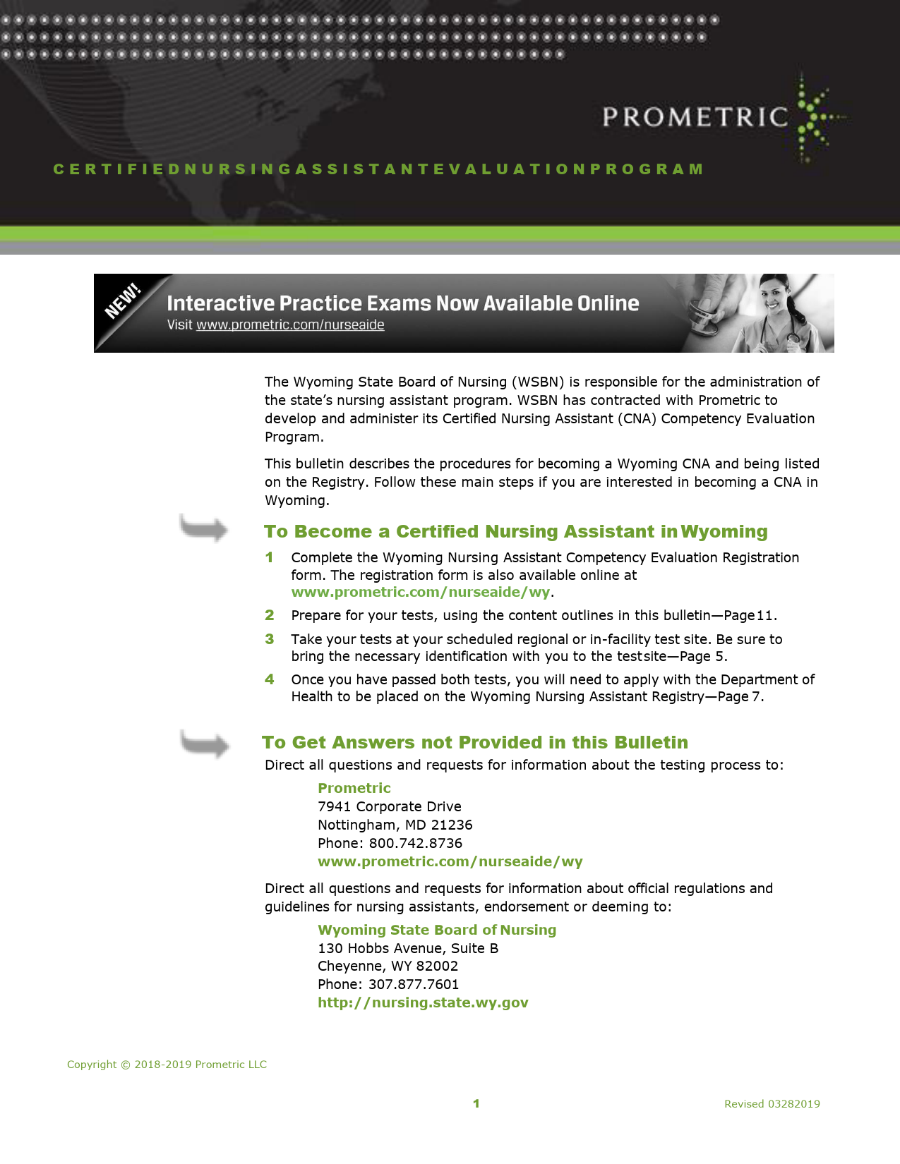 Direct all questions and requests for information about the testing process to: Prometric 7941 Corporate Drive Nottingham, MD 21236 Phone: 800.742.8736 www.prometric.com/nurseaide/wy