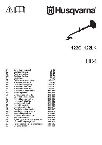 The Husqvarna 122C and 122LK are powered by a two-stroke engine. This manual covers critical aspects such as: