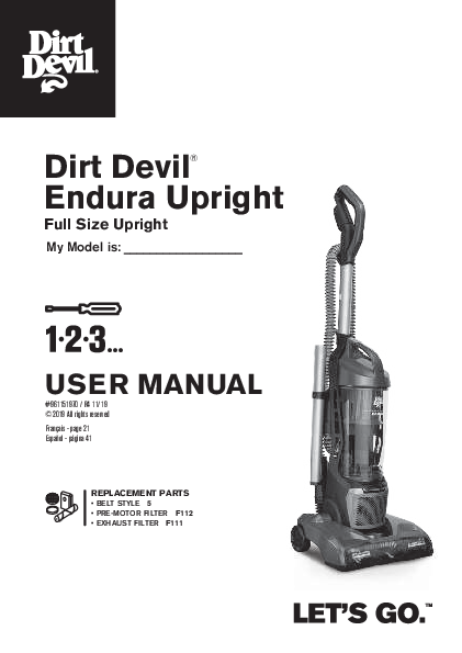 Dirt Devil® Endura Upright Full Size Upright My Model is: __________________ USER MANUAL #961151970 / R4 11/19 ©2019 All rights reserved Français - page 21 Español - página 41 REPLACEMENT PARTS · BELT STYLE 5 · PRE-MOTOR FILTER F112 · EXHAUST FILTER F111 HI. WELCOME. Congrats on purchasing your new Dirt Devil® Upright Carpet + Hard Floor Cyclonic Upright Vacuum. Inside, you'll find everything you want to know from the tools to how to. So what are you waiting for? LET'S GO.TM PRODUCT R EG I STRATI O N Warranty Registration Be sure to register your product online at www.DirtDevil.com or call 1-800-321-1134 to register by phone. Hint: Attach your sales receipt to this Owner's manual. Verification of date of purchase may be required for warranty service of your Dirt Devil® product. For quick reference, please record your product information below. Model #: Mfg. Code: (Mfg. code located on the back or bottom of product) Find GENUINE Replacement Parts at www.dirtdevil.com This product uses the following parts: BELT STYLE ______________________ 5 PRE-MOTOR FILTE _______________ F112 EXHAUST FILTER _________________ F111 2 TABLE OF CO NTE NTS Quick Start Assembly Height Adjust Cord Release Tools How to Troubleshooting Limited Warranty 6-7 8 8 9-11 12-17 18 19 3 WARNING IMPORTANT: READ CAREFULLY BEFORE ASSEMBLY AND USE. THIS PRODUCT IS INTENDED FOR HOUSEHOLD USE ONLY. IF USED COMMERCIALLY WARRANTY IS VOID. IMPORTANT SAFETY INSTRUCTIONS When using an electrical appliance, basic precautions should always be followed, including the following: READ ALL INSTRUCTIONS BEFORE USING THIS APPLIANCE. WARNING: TO REDUCE THE RISK OF FIRE, ELECTRIC SHOCK OR INJURY: · Fully assemble before operating. · Operate cleaner only at voltage specified on data plate on bottom of cleaner. · Do not leave appliance when plugged in. Unplug from outlet when not in use and before cleaning or servicing. · Do not use outdoors or on wet surfaces. · Do not allow to be used as a toy. Not intended for use by children age 12 and under. Close attention is necessary when used by or near children. To avoid injury or damage, keep children away from product, and do not allow children to place fingers or other objects into any openings. · Use only as described in this manual. Use only manufacturer's recommended attachments. · Do not use with damaged cord or plug. If appliance is not working as it should, has been dropped, damaged, left outdoors, or dropped into water, return it to a service center for inspection prior to continuing use. · Do not pull or carry by cord, use cord as handle, close a door on cord, or pull cord around sharp edges or corners. Do not place product on cord. Do not run appliance over cord. Keep cord away from heated surfaces. · Do not unplug by pulling on cord. To unplug, grasp the plug, not the cord. · Do not handle plug or appliance with wet hands. · Do not put any objects into openings. Do not use with any opening blocked; keep free of dust, lint, hair, and anything that may reduce air flow. · Keep hair, loose clothing, fingers, and all parts of body away from openings and moving parts. Brushroll continues to rotate when in upright position. · Turn off all controls before unplugging. · Use extra care when cleaning on stairs. To avoid personal injury or damage, and to prevent the cleaner from falling, always place cleaner at bottom of stairs or on floor. Do not place cleaner on stairs or furniture, as it may result in injury or damage. · Do not use to pick up flammable or combustible liquids, such as gasoline, or use in areas where they may be present. · Unplug before connecting Turbo Tool. · Do not pick up anything that is burning or smoking, such as cigarettes, matches, or hot ashes. · Do not use without filters and/or dirt cup in place. 4 CAUTION: TO REDUCE THE RISK OF DAMAGE: · Avoid picking up hard, sharp objects with this product, as they may cause damage. · Store appropriately indoors in a dry place. Do not expose machine to freezing temperatures. · Do not use sharp objects to clean out hose as they can cause damage. · With brushroll on, do not allow cleaner to sit in one location for an extended period of time, as damage to floor can result. · Brushroll continues to turn while product is turned on and the handle is in the upright position. To avoid damage to carpet, rugs, and flooring, avoid tipping cleaner or setting it on furniture, fringed area rugs or carpeted stairs during tool use. SAVE THESE INSTRUCTIONS WARNING: To reduce the risk of electric shock, this appliance has a polarized plug (one blade is wider than the other). This plug will fit in a polarized outlet only one way. If the plug does not fit fully in the outlet, reverse the plug. If it still does not fit, contact a qualified electrician to install the proper outlet. Do not change the plug in any way. NOTICE A THERMAL PROTECTOR HAS BEEN DESIGNED INTO YOUR CLEANER TO PROTECT IT FROM OVERHEATING. WHEN THE THERMAL PROTECTOR ACTIVATES THE CLEANER WILL STOP RUNNING. If this happens proceed as follows: 1. Turn cleaner OFF and unplug it from the electrical outlet. 2. Empty dirt cup. 3. Inspect the nozzle inlet, hose connector, hose, dirt cup inlet, cyclonic filter, rinsable filter, and HEPA filter. Clear obstructions if present. 4. When cleaner is unplugged and motor cools for 30 minutes, the thermal protector will deactivate and cleaning may continue. If the thermal protector continues to activate after following the above steps, your cleaner needs servicing. 5 QUICK START 1 INSERT HANDLE WAND INTO TOP OF VAC. SECURE YOUR HOSE HERE. 2 NOW, WRAP THE CORD AROUND CORD HOOKS! * 6 *Not all models have this feature QUICK START 3 HANDLE RELEASE PUSH HERE AND PULL HANDLE BACKWARDS TO RECLINE. 4 ON/OFF PEDAL PLUG IN THE CORD AND PRESS HERE TO POWER UP. YOUR DIRT DEVIL IS READY TO CLEAN! NEED HELP? Go to dirtdevil.com/support or contact our Customer Service Department at (800) 321-1134 8:00 a.m. - 7:00 p.m. EST Mon. - Fri. 