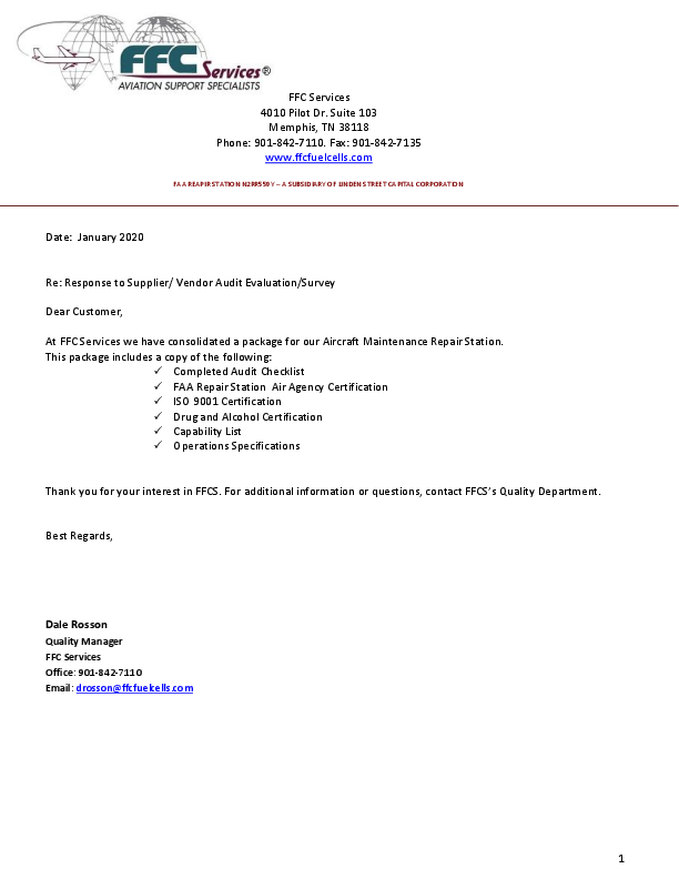 FFC Services 4010 Pilot Dr. Suite 103 Memphis, TN 38118 Phone: 901-842-7110. Fax: 901-842-7135 www.ffcfuelcells.com FAA REAPIR STATION N2RR559Y A SUBSIDIARY OF LINDEN STREET CAPITAL CORPORATION Date: January 2020 Re: Response to Supplier/ Vendor Audit Evaluation/Survey Dear Customer, At FFC Services we have consolidated a package for our Aircraft Maintenance Repair Station. This package includes a copy of the following: Completed Audit Checklist FAA Repair Station Air Agency Certification ISO 9001 Certification Drug and Alcohol Certification Capability List Operations Specifications Thank you for your interest in FFCS. For additional information or questions, contact FFCS's Quality Department. Best Regards, Dale Rosson Quality Manager FFC Services Office: 901-842-7110 Email: drosson@ffcfuelcells.com 1 FFC Services 4010 Pilot Dr. Suite 103 Memphis, TN 38118 Phone: 901-842-7110. Fax: 901-842-7135 www.ffcfuelcells.com Table of Contents Company Information/ Contacts............... 1-3 General........................................................ 4 Quality Assurance........................................ 4 Inspection.................................................... 5 Technical Data............................................. 5 Calibrated Tools......................................... 6 Materials/Parts/Supplies............................... 6 Shelf Life...................................................... 7 Training....................................................... 8 Facilities....................................................... 9 Storage.......................................................... 10 Repair Station Certification.......................... 11 ISO Certification....................................... 12 Drug and Alcohol Certification............... 13-14 Capability List.............................................. 15-22 Ops Spec..................................................... 23-39 2 FFC Services 4010 Pilot Dr. Suite 103 Memphis, TN 38118 Phone: 901-842-7110. Fax: 901-842-7135 www.ffcfuelcells.com Company Information/Contacts Name Address City, State Phone Fax Website FFC Services 4010 Pilot Dr. Suite 103 Memphis, TN 38118 901-842-7110 901-842-7135 www.ffc-fuel-bladders.com Organization Personnel President Quality Manager Sales Manager Fred Tavoleti Dale Rosson Bill Arthur Business Type Aircraft Maintenance Repair Station Certificates FAA Drug/Alcohol ISO 9001 Cert. Number N2RR559Y CONN671B 13577 Major Customers Fed Ex, American Airlines, U S Airways 3 FFC Services 4010 Pilot Dr. Suite 103 Memphis, TN 38118 Phone: 901-842-7110. Fax: 901-842-7135 www.ffcfuelcells.com A GENERAL Yes No N/A Comments Does the provider hold an FAA Air Agency or Transport 1 Canada AMO Certificate? x 14 CFR Part 145 Air Agency Certificate a) Certificate # N2RR559Y x b) Operation Specifications attached x Does the Provider only perform work for which it is 2 authorized on it's Op Spec? x Are the person(s) directly in charge of maintenance 3 authorized on it's Op Spec? x a) Certificates to include company employees and subcontract personnel? x No subcontracting allowed per RSM, ref. 4 Does the repair station observe duty time limitations? x FFCS utilizes a fatigue management program with customer approval required. B QUALITY ASSURANCE Yes 1 Is there an established Quality Control Program? x Does the provider have an up to date QC manual that 2 covers the FAR manual requirements? x a) Does it detail duties, responsibilities and reporting x b) Is the manual current and available to employees in acceptable formats: i.e. paper, CDRom, intra net? x Does the provider have an internal audit and surveillance 3 function? x a) Do you have an established schedule? x b) Is there an established procedure to provide corrective actions for discrepancies? x c) Is there evidence appropriate corrective actions have been applied when necessary? x Do you maintain a file of audit findings and corrective 4 actions for 3 years? x No N/A Comments FFCS is 14 CFR Part 145 and AS9110 Certificated. FFCS uses a dedicated intranet web site as it's regulatory library for the field. FFCS has a monthly schedule of internal audits that cover Part 145 and ISO Standards 4 FFC Services 4010 Pilot Dr. Suite 103 Memphis, TN 38118 Phone: 901-842-7110. Fax: 901-842-7135 www.ffcfuelcells.com Does the provider have an established procedure to ensure segregation of military and commercial parts/ 5 components? FFCS does not purchase or house any aircraft x components or articles. 6 Does your company maintain an approved vendors list? x a) Do Receiving Inspection and Purchasing Department receive copies of the approved vendor's list? x Does the provider have a procedure for reporting defects or nonairworthy conditions to the FAA concerning Dale 7 significant findings within 96 hours of the discovery? Rosson C INSPECTION Yes Does the provider use appropriately licensed/authorized maintenance personnel to sign the maintenance releases, airworthiness releases, inspections, etc. Such personnel 1 shall have met the applicable authority requirements? x Does the provider ensure a proper separation of maintained and inspection responsibilities if they 2 perform required inspections? x Does the provider maintain an up to date roster of persons authorized to conduct required inspections and 3 any restrictions imposed? x Does the provider maintain a roster that identifies all 4 personnel authorized for return to service? x Does the roster maintain a roster identifying all 5 supervisory and inspection personnel? x If stamps are used, is there an acceptable system for the 6 control of stamps for authorized personnel? Does the provider have an acceptable receiving 7 inspection program? x a) Does the provider have an acceptable procedure to identify customer parts? x b) Does the provider inspect and maintain traceability certification on all parts and raw materials? x c) Are incoming shipments checked to the requirements of the Repair or Purchase