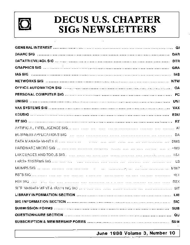 DECUS U.S. CHAPTER SIGs NEWSLETTERS GENERAL INTEREST . . . . . . . . . . . . . .. . . ... . . . . . . . . . . . . . . . . . ... . . . . . . . . . . . . . . . . . . . . . . . . . . . . . . . . . . . . . . GI DAARC SIG . . . . . . . . . . . . . . . . . . . . . . . . . . . . . . . . . . . . . . . . . . . . . . . . . . . . . . . . . . . . . . . . . . . . . . . . . . . . . . . · . . . DAR DATATRIEVE/4GL SIG . . . . . . . . . . . . . . . . . . . . . . . . . . . . . . . . . . . . . . . . . . . . . . . . . . . . . . . . · . . . . . . . . . . . . . . . DTR GRAPHICS SIG . . . . . . . . . . . . . . . . . . . . . . . . . . . . . . . . . . . . . . . . . . . . . . . . . . . . . . . . . . . . . . . . . . . . . . . . . . . . . . . GRA IAS SIG ........................................................................................ IAS NETWORKS SIG . . . . . . . . . . . · . . . . . . . . . . . . . . . . . . . . . . . . . . . . . . . . . . . . . . . . . . . . . . . . . . . . . . . . . . . . . . . . . NTW OFFICE AUTOMATION SIG . . . . . . . . . . . . . . . . . . . . . . . . . . . . . . . . . . . . . . . . . . . . . . . . . . . . . . . . . . . . . . . . . . . . OA PERSONAL COMPUTER SIG . . . . . . . . . . . . . . . . . . . . . . . . . . . . . . . . . . . . . . . . . . . . . . . . . . . . . . . . . . . . . . . . . . . PC UNISIG ..............................................................·.......................... UNI VAX SYSTEMS SIG............................................................................ VAX EDUSIG ....................................................................................... EDU RT SIG .......................................................................................... RT ARTIFICIAL IN;fELLIGENCE SIG ................................................................... Al BUSINESS APPLICATIONS SIG ................................................................. BA DATA MANAGEMENT SIG ..................................................................... OMS HARDWARE MICRO SIG ...................................................................... HMS LANGUAGESANDTOOLSSIG ....................................................... : .......... L&T LARGE SYSTEMS SIG . . . . . . . . . . . . . . . . . . . . . . . . . . . . . . . . . . . . . . . . . . . . . . . . . . . . . . . . . . . . . . . . . . . . . . . . . . . . LS MUMPS SIG .......................................................<........................... MMP RSTS SIG . . . . . . . . . . . . . . . . . . . . . . . . . . . . . . . . . . . . . . . . . . . . . . . . . . . . . . . . . . . . . . . . . . . . . . . . . . . . . . . . . . . . . . . RST RSX SIG ........................................................................................ RSX SITE MANAGEMENT & TRAINING SIG .......................................................... SIT LIBRARY INFORMATION SECTION . . . . . . . . . . . . . . . . . . . . . . . . . . . . . . . . . . . . . . . . . . . . . . . . . . . . . . . . . . . LIB SIG INFORMATION SECTION .......·......................................................... SIC SUBMISSION FORMS . . . . . . . . . . . . . . . . . . . . . . . . . . . . . . . . . . . . . . . . . . . . . . . . . . . . . . . . . . . . . . . . . . . . . . . . SUB QUESTIONNAIRE SECTION . . . . . . . . . . . ·. . . . . . . . . . . . . . . . . . . . . . . . . . . . . . . . . . . . . . . . . . . . . . . . . . . . . . . QU SUBSCRIPTION & MEMBERSHIP FORMS . . . . . . . . . . . . . . . . . . . . . . . . . . . . . . . . . . . . . . . . . . . . . . . . . . . S&M I o June 1988 Volume 3, Number 1 GENERAL TABLE OF CONTENTS SECTIONS PAGE NO. GENERAL INTEREST .Dear SIGs Newsletters Reader . . . . . . . . . . . . . . . . . . . . . . . . . . . . . . . . . . . . . . GI-1 DAARC SIG .Letter fro the Editor . . . . . . . . . . . . .An Application of CIM Using a Personal Computer .Editors Note . . . . . . . . . . . . . . . . . . . . DAR-1 DAR-1 DAR-4 DATATRIEVE/4GL SIG .How Not To Define Your Default Dictionary in DCL....DTR-2 .Wombat Wizard. . . . . . . . . . . . . . . . . . . . . . . . . . . . . . . .Using DATATRIEVE Record Definitions with the SORT/MERGE Utility .VAX RALLY Application Development Topics. . .Ask the Wombat Wizard . . . . . . . . . . . . . .DATATRIEVE/4GL SIG PIR Submission Form. DTR-3 DTR-6 DTR-1 QU-1 . QU-3 GRAPHICS SIG .Submissions. . . .From the Editor. .Woods Meeting Minutes GRA-1 GRA-1 GRA-2 IAS SIG .From the editor's Keyboard. .In This Issue . . . . . . . . .Contribution Guidelines. . . .Ten Years Ago This Month . .IAS Product Panel . . . . . .The Program of the Month Club . IAS-1 . IAS-1 . IAS-1 . IAS-2 . IAS-2 . IAS-4 NETWORKS SIG .Happy Campers! . . . . . . . . . . . . . . . . . . . .Networks and Communications SIG Wishlist ... . .Terminal Servers on Ethernet Local Area Networks. .Biographies . . . . . . . . . . .DATAGRAM . . . . . . . . . . . . . . . . . . . . . NTW-1 NTW-1 NTW-1 NTW-11 QU-11 OFFICE AUTOMATION SIG .From the Editor. .Notes on Notes ....... . OA-1 OA-2 PERSONAL COMPUTER SIG .PRO Section ..... .MACINTOSH Section PC-1 PC-6 UNISIG .Editor's Corner ........ . .Using Ucbmail . . . . . . . . . .Unix as a Window to the World. .The Way it is . . . . . . . . . . . UNI-1 . UNI-3 . UNI-7 . UNI-9 i VAX SYSTEMS SIG .Contributions . . . . . . . . . . .A New Hand at the Tiller . . . . .Spring 1988 SIR Ballot Results .It's On The Tapes . . .VAXNMS Security ...... . EDUSIG .Fellow Educators . .TESTGEN ... RT SIG .From the Editor....... . .Introduction to KERMIT/RT . .The FORTRAN Slate .. .RT-11 Wish List Survey . . . LIBRARY .New Library Programs Available. .Revisions to Library Programs .. SIG INFORMATION SECTION .Special Interest Committee Lists. SUBMISSION FORMS .Submitting Articles to Hard News . QUESTIONNAIRE SECTION .Ask the Wombat Wizard . . . . . . . . . . . . . . . . . . . . . .DATATRIEVE/4GL SIG PIR Submission form . . . . . . . . . .Hardware Submission Form - A SIG Information Interchange .L&T Masters Application .. .L&T Wishlist Q