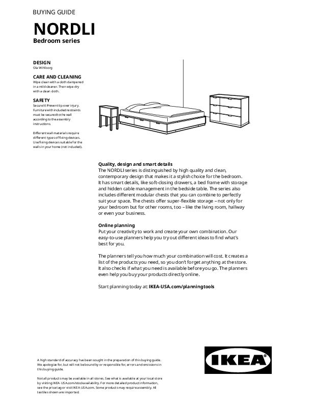 BUYING GUIDE NORDLI Bedroom series DESIGN Ola Wihlborg CARE AND CLEANING Wipe clean with a cloth dampened in a mild cleaner. Then wipe dry with a clean cloth. SAFETY Secure It! Prevent tip-over injury. Furniture with included restraints must be secured to the wall according to the assembly instructions. Different wall materials require different types of fixing devices. Use fixing devices suitable for the walls in your home (not included). Quality, design and smart details The NORDLI series is distinguished by high quality and clean, contemporary design that makes it a stylish choice for the bedroom. It has smart details, like soft-closing drawers, a bed frame with storage and hidden cable management in the bedside table. The series also includes different modular chests that you can combine to perfectly suit your space. The chests offer super-flexible storage not only for your bedroom but for other rooms, too like the living room, hallway or even your business. Online planning Put your creativity to work and create your own combination. Our easy-to-use planners help you try out different ideas to find what's best for you. The planners tell you how much your combination will cost. It creates a list of the products you need, so you don't forget anything at the store. It also checks if what you need is available before you go. The planners even help you buy your products directly online. Start planning today at: IKEA-USA.com/planningtools A high standard of accuracy has been sought in the preparation of this buying guide. We apologize for, but will not be bound by or responsible for, errors and omissions in this buying guide. Not all products may be available in all stores. See what is available at your local store by visiting IKEA-USA.com/stockavailability. For more detailed product information, see the price tag or visit IKEA-USA.com. Some products may require assembly. All textiles shown are imported. WALL ANCHORING GUIDE If your wall material is not listed or if you have questions, consult with a local hardware retailer. We all want our homes to be a safe place. But in our homes, accidents can put children at risk. Working together, we can help prevent these accidents and make the home a safer place. · Secure it! Use the tip-over restraint provided with the product and the right hardware for your wall type. Consult the enclosed guide for help with hardware. · Never put a TV or other heavy objects on top of a chest of drawers or any furniture not intended for use with a TV. · Place heavy objects in the lowest drawers. · Never let children climb or hang on drawers, doors or shelves. Wall material: Drywall or plaster with available wood stud. Anchoring device: Screw inserted directly into stud. For example, a 5 mm wood screw provided with IKEA FIXA plug and screw set. Wall material: Masonry. Anchoring device solid wall: plug with screw. For example, an 8 mm plug provided with IKEA FIXA plug and screw set. Wall material: Drywall or plaster without available wood stud. Anchoring device: Plug with screw. For example, an 8 mm plug provided with IKEA FIXA plug and screw set. Anchoring device hollow wall: Toggle-style. FIXA Screw and plug set $9.99/260pk Contains: Assorted screws and wall plugs for wood, drywall, concrete, and brick. Be aware that different wall materails are able to support different loads of weight. For instance, walls made of drywall cannot support as much weight as walls made of wood, concrete or brick. Recommended for indoor use only. Box/ Divider/Lid: Polypropylene. Plastic fitting: Polyethylene. Screw: Steel, galvanized. 001.692.49 2 BED FRAMES AND ACCESSORIES NORDLI Bed frame with storage Slatted bed base is included, and SKORVA midbeam is not needed for this bed. White Queen King 003.498.49 $399 303.498.57 $499 Anthracite Queen King 503.727.81 $399 003.727.88 $499 NORDLI Bed frame with storage and headboard Slatted bed base is included, and SKORVA midbeam is not needed for this bed. White Queen King 692.414.22 $549 392.414.28 $679 Anthracite Queen King 392.414.09 $549 792.414.12 $679 NORDLI Nightstand W11¾×D19×H26". White 402.192.85 $69.99 NORDLI Headboard Wall mounted. White Queen King 103.729.76 $150 903.727.60 $180 Anthracite Queen King 903.729.77 $150 803.727.94 $180 COMPLEMENTARY PRODUCTS LANGESUND Mirror Ø19". White 602.886.83 $29.99 NISSEDAL Mirror White W25×H25" W15¾×H59" W25×H59" Black W25×H25" W15¾×H59" W25×H59" 203.203.12 303.203.16 103.203.17 $19.99 $29.99 $49.99 503.203.20 303.203.21 703.203.19 $19.99 $29.99 $49.99 3 MODULAR CHEST OF DRAWERS HOW TO BUILD We have a wide range of pre-designed combinations to choose from. Some are included in this buying guide, and more combinations can be found in the store and on our website at IKEA-USA.com You can create the perfect solution to match your needs and taste. There are two simple steps to follow. Start by choosing the width of your solution. The top and plinth are sold together and come in widths of 15¾", 31½", 47¼" and 63". Then choose the size and color of your modular chest of drawers. For the different sizes and available colors, please see the list below. WARNING! TIPPING HAZARD Unanchored furniture can tip over. This furniture shall be anchored to the wall with the enclosed safety fitting to prevent it from tipping over. Remember that the maximum height for stacking NORDLI modular chests of drawers is 57". ALL PARTS AND PRICES TOPS AND BASES NORDLI Top + base W15¾×D18½". White Anthracite 003.838.19 $59 103.914.23 $59 NORDLI Top + base W31½×D18½". White Anthracite 603.834.73 $69 903.660.09 $69 NORDLI Top + base W47¼×D18½". White Anthracite 703.834.77 $79 403.659.98 $79 NORDLI Top + base W63×D18½". White Anthracite 903.834.81 $99 703.660.05 $99 NORDLI Glass top W63×D18½". Transparent 304.607.93 $29.99 NORDLI Glass top W47¼×D18½". Transparent 104.607.94 $24.99 NORDLI Glass top W31½×D18½". Transparent 504.607.92 $19.99 NORDLI Glass top W15¾×D18½". Transparent 704.607.