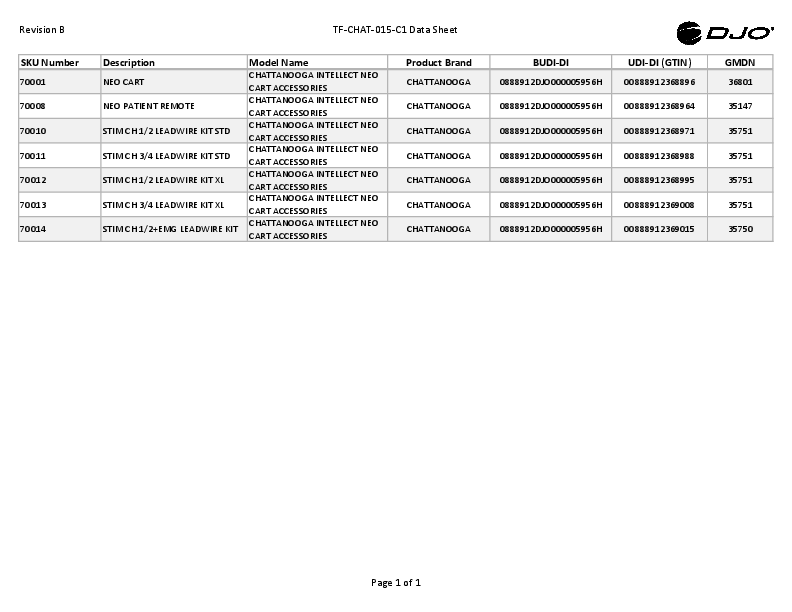 Revision B TF-CHAT-015-C1 Data Sheet SKU Number 70001 70008 70010 70011 70012 70013 70014 Description NEO CART NEO PATIENT REMOTE STIM CH 1/2 LEADWIRE KIT STD STIM CH 3/4 LEADWIRE KIT STD STIM CH 1/2 LEADWIRE KIT XL STIM CH 3/4 LEADWIRE KIT XL STIM CH 1/2+EMG LEADWIRE KIT Model Name CHATTANOOGA INTELLECT NEO CART ACCESSORIES CHATTANOOGA INTELLECT NEO CART ACCESSORIES CHATTANOOGA INTELLECT NEO CART ACCESSORIES CHATTANOOGA INTELLECT NEO CART ACCESSORIES CHATTANOOGA INTELLECT NEO CART ACCESSORIES CHATTANOOGA INTELLECT NEO CART ACCESSORIES CHATTANOOGA INTELLECT NEO CART ACCESSORIES Product Brand CHATTANOOGA CHATTANOOGA CHATTANOOGA CHATTANOOGA CHATTANOOGA CHATTANOOGA CHATTANOOGA BUDI-DI 0888912DJO000005956H 0888912DJO000005956H 0888912DJO000005956H 0888912DJO000005956H 0888912DJO000005956H 0888912DJO000005956H 0888912DJO000005956H UDI-DI (GTIN) 00888912368896 00888912368964 00888912368971 00888912368988 00888912368995 00888912369008 00888912369015 GMDN 36801 35147 35751 35751 35751 35751 35750 Page 1 of 1Acrobat Distiller 11.0 (Windows)