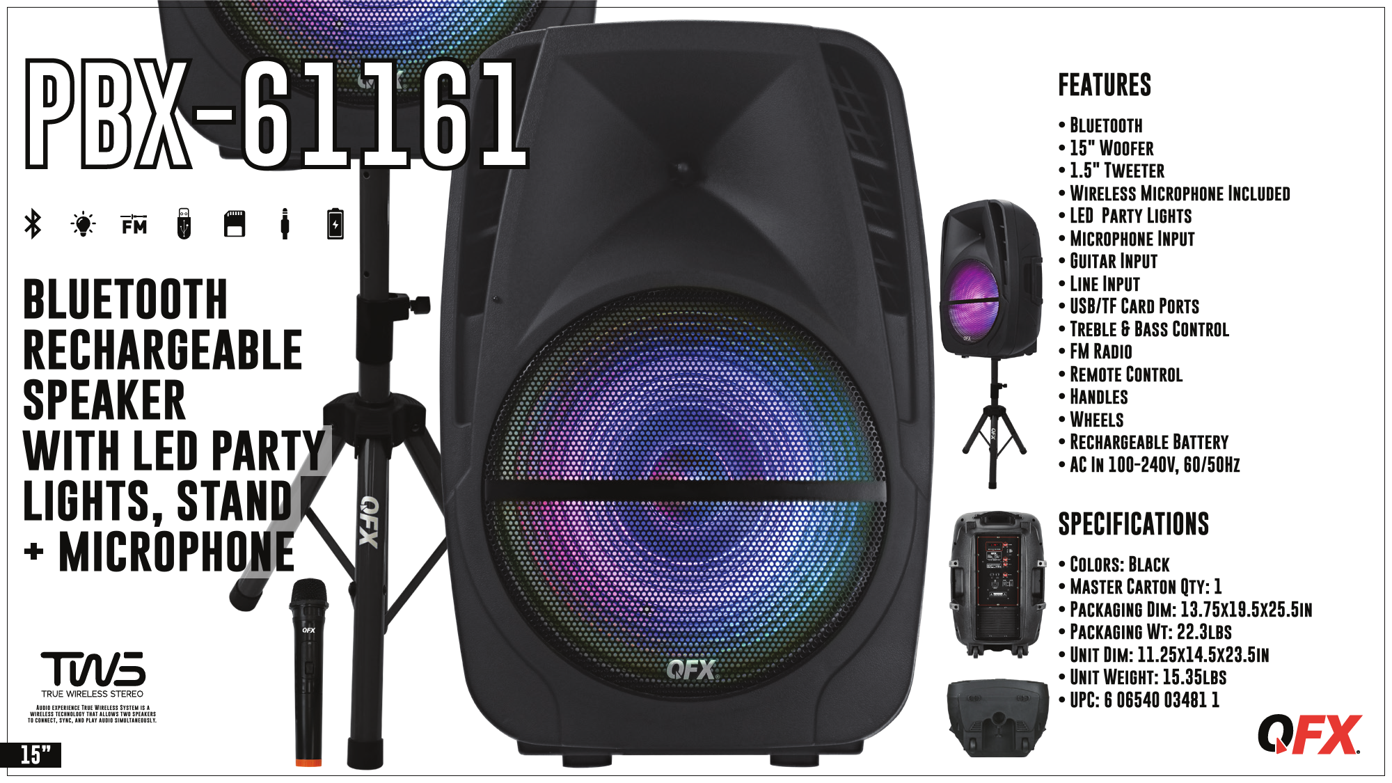PBX-61161 BLUETOOTH RECHARGEABLE SPEAKER WITH LED PARTY LIGHTS, STAND + MICROPHONE Audio experience True Wireless System is a wireless technology that allows two speakers to connect, sync, and play audio simultaneously. 15" FEATURES · Bluetooth · 15" Woofer · 1.5" Tweeter · Wireless Microphone Included · LED Party Lights · Microphone Input · Guitar Input · Line Input · USB/TF Card Ports · Treble & Bass Control · FM Radio · Remote Control · Handles · Wheels · Rechargeable Battery · AC In 100-240V, 60/50Hz SPECIFICATIONS · Colors: Black · Master Carton Qty: 1 · Packaging Dim: 13.75x19.5x25.5in · Packaging Wt: 22.3lbs · Unit Dim: 11.25x14.5x23.5in · Unit Weight: 15.35lbs · UPC: 6 06540 03481 1Adobe PDF library 15.00 Adobe Illustrator 25.2 (Macintosh)