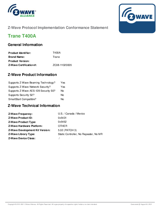 Z-Wave Protocol Implementation Conformance Statement Trane T400A General Information Product Identifier: Brand Name: Product Version: Z-Wave Certification #: T400A Trane ZC08-11020005 Z-Wave Product Information Supports Z-Wave Beaming Technology? Yes Supports Z-Wave Network Security? Yes Supports Z-Wave AES-128 Security S0? No Supports Security S2? No SmartStart Compatible? No Z-Wave Technical Information Z-Wave Frequency: Z-Wave Product ID: Z-Wave Product Type: Z-Wave Hardware Platform: Z-Wave Development Kit Version: Z-Wave Library Type: Z-Wave Device Class: U.S. / Canada / Mexico 0x5431 0x5452 OTHER 5.02 (PATCH 3) Static Controller, No Repeater, No MR / Copyright © 2012-2021 Z-Wave Alliance. All Rights Reserved. All Logos property of respective rights' holders, no claim intended. Generated @ August 24, 2021PDFjet v3.03 (http://pdfjet.com)