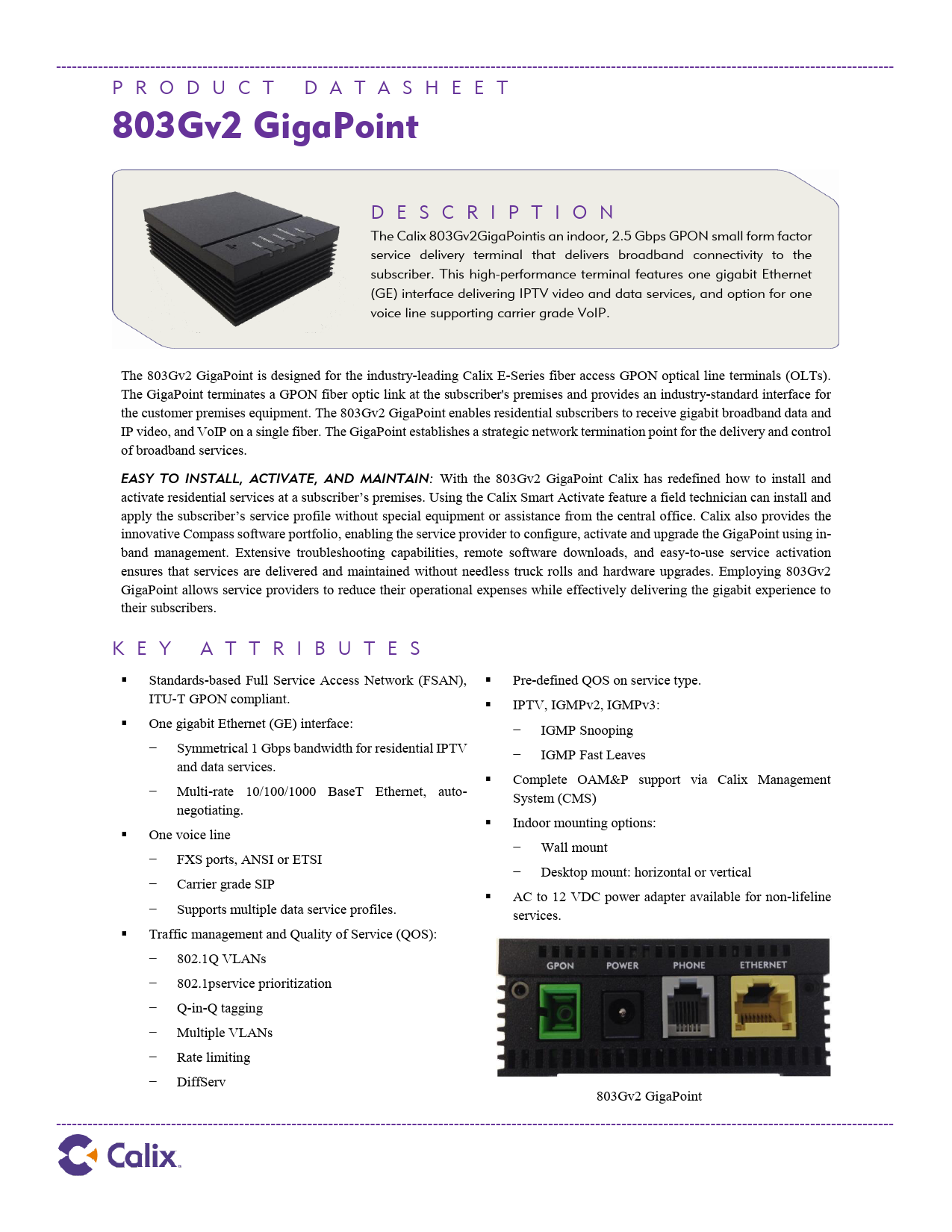 ---------------------------------------------------------------------------------------------------------------------------------------------------------------PRODUCT DATASHEET 803Gv2 GigaPoint DESCRIPTION The Calix 803Gv2GigaPointis an indoor, 2.5 Gbps GPON small form factor service delivery terminal that delivers broadband connectivity to the subscriber. This high-performance terminal features one gigabit Ethernet (GE) interface delivering IPTV video and data services, and option for one voice line supporting carrier grade VoIP. The 803Gv2 GigaPoint is designed for the industry-leading Calix E-Series fiber access GPON optical line terminals (OLTs). The GigaPoint terminates a GPON fiber optic link at the subscriber's premises and provides an industry-standard interface for the customer premises equipment. The 803Gv2 GigaPoint enables residential subscribers to receive gigabit broadband data and IP video, and VoIP on a single fiber. The GigaPoint establishes a strategic network termination point for the delivery and control of broadband services. EASY TO INSTALL, ACTIVATE, AND MAINTAIN: With the 803Gv2 GigaPoint Calix has redefined how to install and activate residential services at a subscriber's premises. Using the Calix Smart Activate feature a field technician can install and apply the subscriber's service profile without special equipment or assistance from the central office. Calix also provides the innovative Compass software portfolio, enabling the service provider to configure, activate and upgrade the GigaPoint using inband management. Extensive troubleshooting capabilities, remote software downloads, and easy-to-use service activation ensures that services are delivered and maintained without needless truck rolls and hardware upgrades. Employing 803Gv2 GigaPoint allows service providers to reduce their operational expenses while effectively delivering the gigabit experience to their subscribers. KEY ATTRIBUTES Standards-based Full Service Access Network (FSAN), Pre-defined QOS on service type. ITU-T GPON compliant. IPTV, IGMPv2, IGMPv3: One gigabit Ethernet (GE) interface: - IGMP Snooping - Symmetrical 1 Gbps bandwidth for residential IPTV - IGMP Fast Leaves and data services. Complete OAM&P support via Calix Management - Multi-rate 10/100/1000 BaseT Ethernet, auto- System (CMS) negotiating. Indoor mounting options: One voice line - Wall mount - FXS ports, ANSI or ETSI - Desktop mount: horizontal or vertical - Carrier grade SIP AC to 12 VDC power adapter available for non-lifeline - Supports multiple data service profiles. services. Traffic management and Quality of Service (QOS): - 802.1Q VLANs - 802.1pservice prioritization - Q-in-Q tagging - Multiple VLANs - Rate limiting - DiffServ 803Gv2 GigaPoint ---------------------------------------------------------------------------------------------------------------------------------------------------------------- ---------------------------------------------------------------------------------------------------------------------------------------------------------------SPECIFICATIONS 803Gv2 GigaPoint DIMENSIONS Width:3.0 in (7.6 cm) Height:4.0 in (10.2 cm) Depth:1.25in (3.2 cm) Weight:4oz. (.1kg) PON CHARACTERISTICS Max. split: 64 GPON Max. reach: 58 km (36 miles) with C+/FEC Maximum Optical Distribution Network (ODN) Attenuation: GPON Class B+, 28 dB 1490 ± 10 nm optical receiver: 27.0 to 8.0 dBm 1310 ± 20 nm optical transmitter: 0.5 to 5.0 dBm INTERFACES Data/IPTV: One 10/100/1000 BaseT Ethernet port, RJ-45 connector Telephony (803Gv2): One RJ-11 connector PON: Single 9/125 µm (single mode) fiber, SC/APC connector, minimum 50 dB return loss Power: 2-pin connector TELEPHONY General: SIP Number of lines:1 RENs:5 maximum Drop length: Maximum 500 feet (152.4 m) DS0 Output: 25 mA Ring Voltage:4555 VAC ENVIRONMENTAL Operating temperature: Indoor ambient temperature, 0° to 40°C (32° to 104°F) Operating/storage relative humidity: 10 to 95 % non-condensing Altitude: 0 to 10,000 feet (0 to 3,048 m) above sea level DATA Drop length:328 feet (100 m) maximum using CAT5 cable Auto MDI/MDIX crossover for 1000BASE-TX, 100BASE-TX, and 10BASE-T ports Traffic Management and QOS: 802.1Q VLAN; 802.1pVoice, Video, Data and Management Priorities; Q-in-Q tagging; Per-Port Rate Shaping; Rate Limiting CERTIFICATION AND COMPLIANCE Emissions: FCC Part 15 Class B IC ICES-003 Class B CISPR-32 Safety: UL 60950 and UL 1697 approved IEEE:802.3, 802.3AB, 802.3U, 802.11p, 802.11Q POWERING AND ALARMS 2-pin connector Input voltage: 12 VDC (nominal), 10 VDC (min.), 15 VDC (max) External Power Adapter: 12 VDC, 1A Typical Power: 5 W, Peak Power: 7 W 2-pin power cable for UPS support Dying Gasp ORDERING INFORMATION Calix 803Gv2 GigaPoint 100-04797......................... 803Gv2 GigaPoint, 1 GE, 1 POTS ---------------------------------------------------------------------------------------------------------------------------------------------------------------- 1035 N. McDowell Blvd., Petaluma CA 94954 TEL: 877.766.3500 WWW.CALIX.COM © Calix. All Rights Reserved. 250-00367 Rev.10 Page 2Microsoft Word 2016