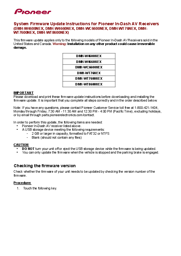 System Firmware Update Instructions for Pioneer In-Dash AV Receivers (DMH-W4600NEX, DMH-W4660NEX, DMH-WC6600NEX, DMH-WT76NEX, DMHWT7600NEX, DMH-WT8600NEX) This firmware update applies only to the following models of Pioneer In-Dash AV Receivers sold in the United States and Canada. Warning: Installation on any other product could cause irreversible damage. DMH-W4600NEX DMH-W4660NEX DMH-WC6600NEX DMH-WT76NEX DMH-WT7600NEX DMH-WT8600NEX IMPORTANT Please download and print these firmware update instructions before downloading and installing the firmware update. It is important that you complete all steps correctly and in the order described below. Note: If you have any questions, please contact Pioneer Customer Service toll free at 1-800-421-1404, Monday through Friday, 7:30 AM - 11:30 AM and 12:30 PM - 4:00 PM (Pacific Time), excluding holidays, or by email through parts.pioneerelectronics.com/contact. In order to perform this update, the following items are needed: · Pioneer In-Dash AV receiver listed above. · A USB storage device meeting the following requirements: - 2 GB or larger in capacity, formatted to FAT32 or NTFS - Blank (should not contain any files) CAUTION · DO NOT turn your unit off or eject the USB storage device while the firmware is being updated. · You can only update the firmware when the vehicle is stopped and the parking brake is engaged. Checking the firmware version Check whether the firmware of your unit needs to be updated by checking the version number of the firmware. Procedure: 1. Touch the following key. The "System" screen appears. 2. Scroll down the list and touch [System Information]. 3. Touch [Firmware information]. 4. After the "Firmware Information" screen appears, Check the firmware version number and model name. Downloading the firmware update files from Pioneer's website 1. Download the firmware update files by clicking on the following link and finding your product: https://www.pioneerelectronics.com/PUSA/Support/Downloads 2. Extract the download file. The downloaded ZIP file will produce the following file when decompressed: (See the table below) Model Name DMH-W4600NEX DMH-W4660NEX DMH-WC6600NEX DMH-WT76NEX DMH-WT7600NEX DMH-WT8600NEX Update is necessary when Current version is lower than 1.31 Current version is lower than 1.31 Current version is lower than 1.31 Current version is lower than 1.31 Current version is lower than 1.31 Current version is lower than 1.31 File Name DMH-W4600NEX.avh DMH-W4660NEX.avh DMH-WC6600NEX.avh DMH-WT76NEX.avh DMH-WT7600NEX.avh DMH-WT8600NEX.avh Version 1.31 1.31 1.31 1.31 1.31 1.31 Updating the firmware on your unit IMPORTANT DMH-W4600NEX DMH-W4660NEX DMH-WC6600NEX DMH-WT76NEX DMH-WT7600NEX DMH-WT8600NEX · DO NOT perform this firmware update if the model number of your Pioneer product is anything other than one of the above models. · Ensure that the update file is located within the root (top) folder of your USB storage device. There should be no other files within the USB storage device. · While your unit is being updated, DO NOT turn off the system's power and DO NOT touch the unit's touchscreen as this may result in severe damage to your unit. · DO NOT remove the USB storage device during the firmware update process. · Performing the firmware update will restore all settings to their default values. · Disconnect any external mobile devices that are currently connected to your unit. Procedure: 1. Connect a blank (formatted) USB storage device to your computer, and then locate the correct update file and copy it onto the USB storage device. 2. Connect the USB storage device to the USB port. 3. Set the audio source to "OFF" on your unit. 4. Touch the following keys in the following order. The "System" screen appears. 5. Scroll down the list and touch [System information]. 6. Touch [Firmware Update]. The "Firmware Update" screen appears. 7. Touch [USB]. 8. Touch [Continue] to display the data transfer mode. It will take a while to load, so please wait. 9. Read the "WARNING," then touch the [Start] button to start the update process. If it shows "ERROR" on the display, try another USB device. Installation of the firmware update will start. 10. The progress is displayed during the updating. DO NOT turn your unit off or eject the USB storage device while the firmware is being updated. 11. Display will show "It succeeded" when the update is complete. Please disconnect the USB storage device. 12. The product will reboot after the update is finished. Do not touch anything even when the screen is blacked out. After it has finished rebooting, the screen will return to the menu screen. 13. The firmware update is now complete. Your Pioneer AV Receiver is now ready for use. Confirm that the firmware has been updated Perform the same procedure for "Displaying the firmware version" to confirm that the firmware has been updated. Procedure: 1. Touch the following key. The "System" screen appears. 2. Scroll down the list and touch [System Information]. 3. Touch [Firmware information]. 4. After the "Firmware Information" screen appears, Check the firmware version number and model name. If you have any difficulty performing these instructions, please contact Pioneer Customer Service toll free at 1-800-421-1404, Monday through Friday, 7:30 AM - 11:30 AM and 12:30 PM - 4:00 PM (Pacific Time), excluding holidays, or online through parts.pioneerelectronics.com/contact. -----------------------------------------------------------Copyright 2021 Pioneer Corporation