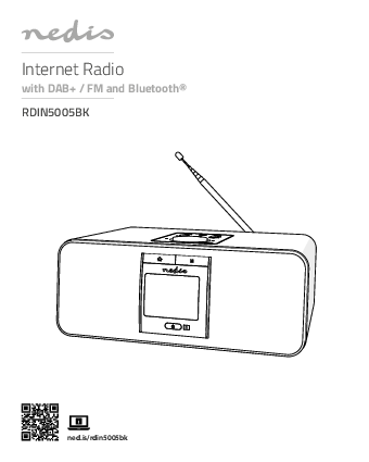 Internet Radio with DAB+ / FM and Bluetooth® RDIN5005BK ned.is/rdin5005bk a Quick start guide 6 c Kurzanleitung 11 b Guide de démarrage rapide 17 d Snelstartgids 22 j Guida rapida all'avvio 28 h Guía de inicio rápido 33 i Guia de iniciação rápida 39 e Snabbstartsguide 44 g Pika-aloitusopas 50 f Hurtigguide 55 2 Vejledning til hurtig start 60 k Gyors beüzemelési útmutató 66 n Przewodnik Szybki start 71 x 77 1 Rýchly návod 82 l Rychlý návod 88 y Ghid rapid de iniiere 93 A 1 2 3 7 8 4 5 6 B 9 q w t y u i e STOP PREV PRESET PLAY NEXT r o p Press to Select C a j s h 9 e o k d l t z f x p c g v h a Quick start guide Internet Radio RDIN5005BK For more information see the extended manual online: ned.is/rdin5005bk Intended use The Nedis RDIN5005BK is a multifunctional internet radio. The radio incorporates FM, DAB+ and internet radio. The product is equipped with timer, alarm, nap, dimmer, sleeper and weather forecast functions. You can control the radio manually, with remote or pair it with your smartphone or tablet via Bluetooth to stream music. The product is intended for indoor use only. The product is not intended for professional use. This product is not intended for use by persons (including children) with a reduced physical, sensory or mental capabilities or lack of experience and knowledge, unless they have been given supervision or instruction concerning the use of the product by a person responsible for their safety. Any modification of the product may have consequences for safety, warranty and proper functioning. Specifications Product Article number Dimensions (w x h x d) Weight Power input Wireless connection Bluetooth® version Bluetooth® frequency range Bluetooth® radio transmit power Bluetooth® antenna gain Wi-Fi Wi-Fi frequency range Wi-Fi radio transmit power Wi-Fi antenna gain Radio bands FM frequency range DAB+ frequency range Audio power output (RMS) Audio peak power output Driver size Internet Radio RDIN5005BK 255 x 180 x 105 mm 1.4 kg 100 - 240 V Wi-Fi / Bluetooth® 5.0 + EDR 2402 - 2480 MHz 4 dBm 0 dBi 802.11b/g/n (WLAN) 2400 - 2843.5 MHz 18.5 dBm 2 dBi FM / DAB+ 87.5 - 108 MHz 174.928 - 239.2 MHz 2 x 7 W 2 x 21 W 2 x 2.5" 6 Display Supported media playback Streaming protocols USB charging port Connection output Saving radio presets Power consumption in use Power consumption standby Main parts (image A) 1 Antenna 2 Radio 3 USB charging port 4 3.5 mm headphones output Safety instructions --WARNING TFT 2.4" MP3, WMA, AAC, FLAC, WAV UpnP, DLNA 5 VDC / 1 A Headphones > 250 stations 29 W < 2 W 5 Remote control 6 Power cable 7 Antenna holder 8 Power input To prevent possible hearing damage, do not listen at high volume levels for long periods. · Ensure you have fully read and understood the instructions in this document before you install or use the product. Keep this document for future reference. · Only use the product as described in this document. · Do not use the product if a part is damaged or defective. Replace a damaged or defective product immediately. · Do not drop the product and avoid bumping. · This product may only be serviced by a qualified technician for maintenance to reduce the risk of electric shock. · Unplug the product from the power source and other equipment if problems occur. · Only use the provided power cable. · Do not expose the product to water or moisture. · Do not use the product where splashing of water might occur, e.g. bathroom, swimming pool or close to a washbowl. · Do not use this product in a bathtub, shower, or water-filled reservoir. · Observe the plus (+) and minus () marks on the cell, battery and equipment and ensure correct use. · Do not use any cell or battery that is not designed for use with the product. · Seek medical advice immediately if a cell or a battery has been swallowed. · Use only the cell or battery in the application for which it was intended. · Battery usage by children should be supervised. · Do not mix cells of different manufacture, capacity, size or type within a product. 7 · Properly dispose of the empty battery. · When possible, remove the battery from the product when not in use. · Protect the eyes against exposure to visible and/or infrared radiation. Take adequate precautions when exposed. · The product might cause interference with nearby devices. · Do not use the product at locations where the use of wireless devices is prohibited due to potential interference with other electronic devices, which may cause safety hazards. · Do not cover the product when in use. · Place the product on a stable and flat surface. · Do not use a timer or a separate remote-control system that switches on the product automatically. · Keep distance from flammable objects. · Do not open the product. · Do not use an extension cable. · Do not leave the product unattended when switched on. · Keep the product out of reach from children. · Listening on high volume for a long time will damage your hearing. · Do not repair the product. If damaged, it must be properly disposed of. Place the battery 1. Insert the required batteries into the battery compartment on the rear of the remote control A5. 44Observe the plus (+) and minus () marks on the cell, battery and equipment and ensure correct use. Connecting the product 1. Plug the power cable A6 into the power input A8. 2. Plug the other end of A6 into a power outlet. Charging your phone 1. Connect a smartphone or tablet with a USB cable to the USB port A3 to charge the device. Controls on the radio (image B) 9 Menu button q Display w On / standby button e Mode button r Remote control sensor t Left button Right button y Preset 1 / STOP button Preset 2 / PLAY button Press to return to the menu. Shows information and settings. Press to enter or exit standby mode. Press to switch between audio sources. Point the remote control to the sensor. Press to select the previous radio station, track or menu item. Press to select the next radio station, tra
