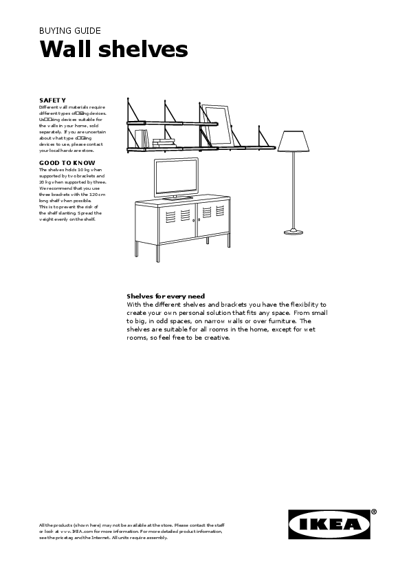 BUYING GUIDE Wall shelves SAFETY Different wall materials require different types ofxing devices. Usxing devices suitable for the walls in your home, sold separately. If you are uncertain about what type oxing devices to use, please contact your local hardware store. GOOD TO KNOW The shelves holds 10 kg when supported by two brackets and 20 kg when supported by three. We recommend that you use three brackets with the 120 cm long shelf when possible. This is to prevent the risk of the shelf slanting. Spread the weight evenly on the shelf. Shelves for every need With the different shelves and brackets you have the flexibility to create your own personal solution that fits any space. From small to big, in odd spaces, on narrow walls or over furniture. The shelves are suitable for all rooms in the home, except for wet rooms, so feel free to be creative. All the products (shown here) may not be available at the store. Please contact the staff or look at www.IKEA.com for more information. For more detailed product information, see the pricetag and the Internet. All units require assembly. WALL ANCHORING GUIDE We all want our homes to be a safe place. With the your wall shelf will be a safe place for your favourite things. Here are some things to think about when installing your wall shelf. · It's the xing devices to the brackets that determine how steady and stable your wall shelf will be. · Different wall materials require different types of xing devices that's why we don't include them with our brackets. Instead, it's important that you choose xing devices that are suitable for your wall. · Be aware that different wall materials are able to support different loads of weight. For instance, wall made of plaster cannot support as much weight as walls made of wood, concrete or brick. · If you don'nd what you need in the FIXA range, we recommend you contact your local hardware store. · Never let children climb or hang on the shelf. Wall Material: Drywall or plaster with available wood stud. Anchoring device: Screw inserted directly into stud. for example, a 5 mm screw provided with IKEA FIXA plug and screw set. Wall Material: Drywall or plaster without available wood stud. Anchoring device: Plug with screw. For example, an 8 mm plug provided with IKEA FIXA plug and screw set. Wall Material: Masonry. Anchoring device: Plug with screw. For example, an 8 mm plug provided with IKEA FIXA plug and screw set. Anchoring device hollow wall: Toggle-style COMBINATIONS Mix and match to suit your needs with shelves and brackets. Our big choice of sizes, including shelves you can cut to the exact length you need, means you can a shelf to match almost any space. Here are some suggestions. BURHULT/EKBY STÖDIS wall shelf. Total size: W59×D20×H20 cm. This combination Rs.399 White/white White/black 992.904.92 292.904.95 Articles for this combination BURHULT shelf 59×20 cm, white EKBY STÖDIS bracket 18×18 cm, white, black or red 1 pcs 2 pcs BERGSHULT/GRANHULT wall shelf. Total size: W80×D20×H12 cm. This combination Rs 1240 White/nickel-plated Brown-black/nickel-plated 092.908.25 192.908.20 Articles for this combination BERGSHULT shelf 80×20cm, white, black-brown or dark grey GRANHULT bracket 20×12 cm, nickel-plated 2-pc 1 pcs 1pc BERGSHULT/EKBY HÅLL wall shelf. Total size: W80×D30×H21 cm. This combination Rs 1190 White/black Brown-black/black 292.907.92 292.907.87 Articles for this combination BERGSHULT shelf 80×30 cm, white, black-brown or dark grey EKBY HÅLL bracket 18×24 cm, black 1 pcs 2 pcs 2 3 COMBINATIONS COMBINATIONS BERGSHULT/PERSHULT wall shelf. Total size: W120×D20×H30 cm. This combination Rs 1740 White/white 192.907.02 Brown-black/white 092.907.12 Articles for this combination BERGSHULT shelf 120×20 cm, white, black-brown or dark grey PERSHULT bracket 20×30 cm, white or chrome-plated 1 pcs 3 pcs BERGSHULT/PERSHULT wall shelf combination. Total size: W120×D30×H90 cm. This combination Rs 6720 White/white Brown-black/white 392.911.59 492.911.54 Articles for this combination BERGSHULT shelf 120×30 cm, white, black-brown or dark grey PERSHULT bracket 30×30 cm, white or chrome-plated 3 pcs 9 pcs BURHULT/EKBY STÖDIS wall shelf combination. Total size: W59×D20×H45 cm. This combination Rs.798 White/white 092.912.07 Articles for this combination BURHULT shelf 59×20 cm, white EKBY STÖDIS bracket 18×18 cm, white 2 pcs 4 pcs 4 5 ALL PARTS AND PRICES SHELVES BURHULT shelf, 59×20 cm. Thickness: 1,5 cm. To be completed with 2 brackets, placed a minimum of 50 cm apart. Max. load 10 kg. White 704.305.20 Rs.299 BERGSHULT shelf, 80×20 cm. Thickness: 2.5 cm. To be completed with 2 brackets, placed a minimum of 70 cm apart. Max load 10 kg. BERGSHULT has one bevelled and one smooth edge on the long side - choose the side you like the most. White 804.305.10 Rs.590 Brown-black 604.305.06 Rs.590 BERGSHULT shelf, 80×30 cm. Thickness: 2.5 cm. To be completed with 2 brackets, placed a minimum of 70 cm apart. Max load 10 kg. BERGSHULT has one bevelled and one smooth edge on the long side - choose the side you like the most. White 504.305.16 Rs.790 Brown-black 404.305.12 Rs.790 BERGSHULT shelf, 120×20 cm. Thickness: 2.5 cm. To be completed with 2 or 3 brackets, placed a maxi- mum of 80 cm apart. Max load 10 kg when the shelf is supported by 2 bracket and max load 20 kg when supported by 3 brackets. BERGSHULT has one bevelled and one smooth edge on the long side - choose the side you like the most. White 804.304.97 Rs.990 Brown-black 704.304.93 Rs.990 BERGSHULT shelf, 120×30 cm. Thickness: 2.5 cm. To be completed with 2 or 3 brackets, placed a maxi- mum of 80 cm apart. Max load 10 kg when the shelf is supported by 2 bracket and max load 20 kg when supported by 3 brackets. BERGSHULT has one bevelled and one smooth edge on the long side - choose the side you like the most. White 104.305.04 Rs.1190 Brown-black 404.304.99 Rs.1190 EKBY ALEX shelf with drawers, 119×29 cm. Thickness: 11,5 cm. To be com