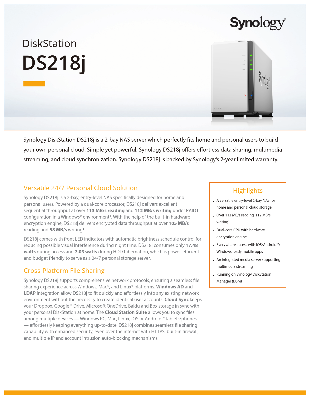 DiskStation DS218j Synology DiskStation DS218j is a 2-bay NAS server which perfectly fits home and personal users to build your own personal cloud. Simple yet powerful, Synology DS218j offers effortless data sharing, multimedia streaming, and cloud synchronization. Synology DS218j is backed by Synology's 2-year limited warranty. Versatile 24/7 Personal Cloud Solution Synology DS218j is a 2-bay, entry-level NAS specifically designed for home and personal users. Powered by a dual-core processor, DS218j delivers excellent sequential throughput at over 113 MB/s reading and 112 MB/s writing under RAID1 configuration in a Windows® environment1. With the help of the built-in hardware encryption engine, DS218j delivers encrypted data throughput at over 105 MB/s reading and 58 MB/s writing1. DS218j comes with front LED indicators with automatic brightness schedule control for reducing possible visual interference during night time. DS218j consumes only 17.48 watts during access and 7.03 watts during HDD hibernation, which is power-efficient and budget friendly to serve as a 24/7 personal storage server. Cross-Platform File Sharing Synology DS218j supports comprehensive network protocols, ensuring a seamless file sharing experience across Windows, Mac®, and Linux® platforms. Windows AD and LDAP integration allow DS218j to fit quickly and effortlessly into any existing network environment without the necessity to create identical user accounts. Cloud Sync keeps your Dropbox, GoogleTM Drive, Microsoft OneDrive, Baidu and Box storage in sync with your personal DiskStation at home. The Cloud Station Suite allows you to sync files among multiple devices -- Windows PC, Mac, Linux, iOS or AndroidTM tablets/phones -- effortlessly keeping everything up-to-date. DS218j combines seamless file sharing capability with enhanced security, even over the internet with HTTPS, built-in firewall, and multiple IP and account intrusion auto-blocking mechanisms. Highlights · A versatile entry-level 2-bay NAS for home and personal cloud storage · Over 113 MB/s reading, 112 MB/s writing1 · Dual-core CPU with hardware encryption engine · Everywhere access with iOS/AndroidTM/ Windows ready mobile apps · An integrated media server supporting multimedia streaming · Running on Synology DiskStation Manager (DSM) Your Well-Rounded Multimedia Center With various tools supported by DS218j, managing your multimedia content has never been easier. Photo Station's intuitive design allows you to effortlessly organize photos into customized categories, smart albums, and blog posts; as well as link them to social networking websites like Facebook, Twitter, Flickr, and Weibo with just a few clicks. Audio Station comes with a built-in lyrics plugin, Internet radios, and support for DLNA® and AirPlay® speakers for quality playback. With Video Station, you can watch movies and TV shows online or directly through the DS video app on Apple TV. Anywhere/Anytime Availability Synology provides mobile applications that allow you to enjoy your multimedia library even when on the go. Available on iOS, AndroidTM and Windows Phone® platforms, DS photo, DS audio, DS video, and DS file enable access to your Synology NAS through Photo Station, Audio Station, Video Station, and File Station. What's more, you can use DS get to remotely manage and monitor download tasks on Download Station. Effective Sync & Backup Solution Synology DS218j can serve as a centralized backup destination, allowing you to back up files from multiple devices via Cloud Station Backup QuickConnect allows you to connect via a simple customizable address so that you can instantly access media and work files on any Windows/Mac/Linux computer, laptop, or mobile device. Easy Backup Solutions With block-level incremental backup and cross-version deduplication, Synology Hyper Backup provides multi-version backup with optimized storage utilization and allows data backup to multiple destinationslocal shared folders, external hard drives, network shared folders, rsync servers, and public cloud services. Multimedia Streaming DS218j turns your living room into a multimedia entertainment center. Running on Synology DiskStation Manager (DSM) Synology DiskStation Manager (DSM) is a web-based operating system tailor-made for every Synology NAS. Featuring an intuitive multitasking user interface, DSM provides simple destop-like experience to minimize effort in exploring and managing your Synology NAS. The built-in Package Center allows you to download and install a variety of packages designed specifically for your unique needs, ranging from file backup, multimedia sharing , productivity tools, safeguard security and utilities. With all the built-in and add-on features, DSM provides you with complete and fine-grained control of your DS218j, helping you maximize productivity and make the best out of of your digital assets. All will happen with just a few clicks. Hardware Overview Front Rear 1 2 3 5 6 4 7 9 8 10 1 Status indicator 5 Fan 9 1GbE RJ-45 port 2 LAN indicator 6 USB 3.0 port 10 Kensington Security Slot 3 Drive status indicator 7 Reset button Technical Specifications Hardware CPU Hardware encryption engine Memory Compatible drive type External ports Size (HxWxD) Weight LAN Wake on LAN/WAN Scheduled power on/off System fan AC input power voltage Power frequency Operating temperature Storage temperature Relative humidity Maximum operating altitude Marvell Armada 385 88F6820 dual-core 1.3GHz Yes DDR3 512MB 2 x 3.5" or 2.5" SATA HDD/SSD (drives not included) 2 x USB 3.0 port 165 x 100 x 225.5 mm 0.87 kg Gigabit (RJ-45) x 1 Yes Yes 92 x 92 x 25 mm 100V to 240V 50/60Hz, single phase 5°C to 40°C (40°F to 104°F) -20°C to 60°C (-5°F to 140°F) 5% to 95% RH 5,000 m (16,400 ft) General DSM Specification Networking protocol File system Supported RAID type Storage management File sharing capability Privilege SMB, AFP, NFS, FTP, WebDAV, CalDAV, Telnet, SSH, SNMP, VPN (PPTP, OpenVPN TM ,