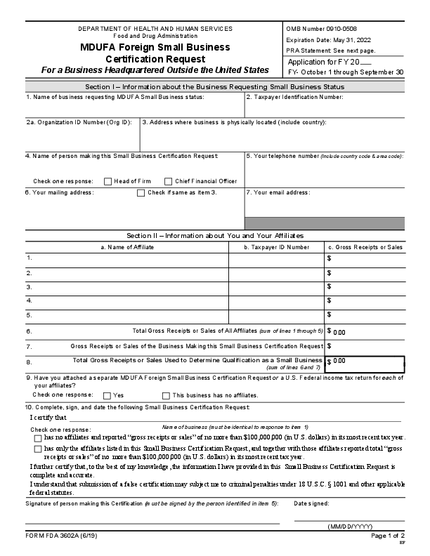 Instructions for Completing Form FDA 3602A (MDUFA Foreign Small Business Certification Request, for a Business