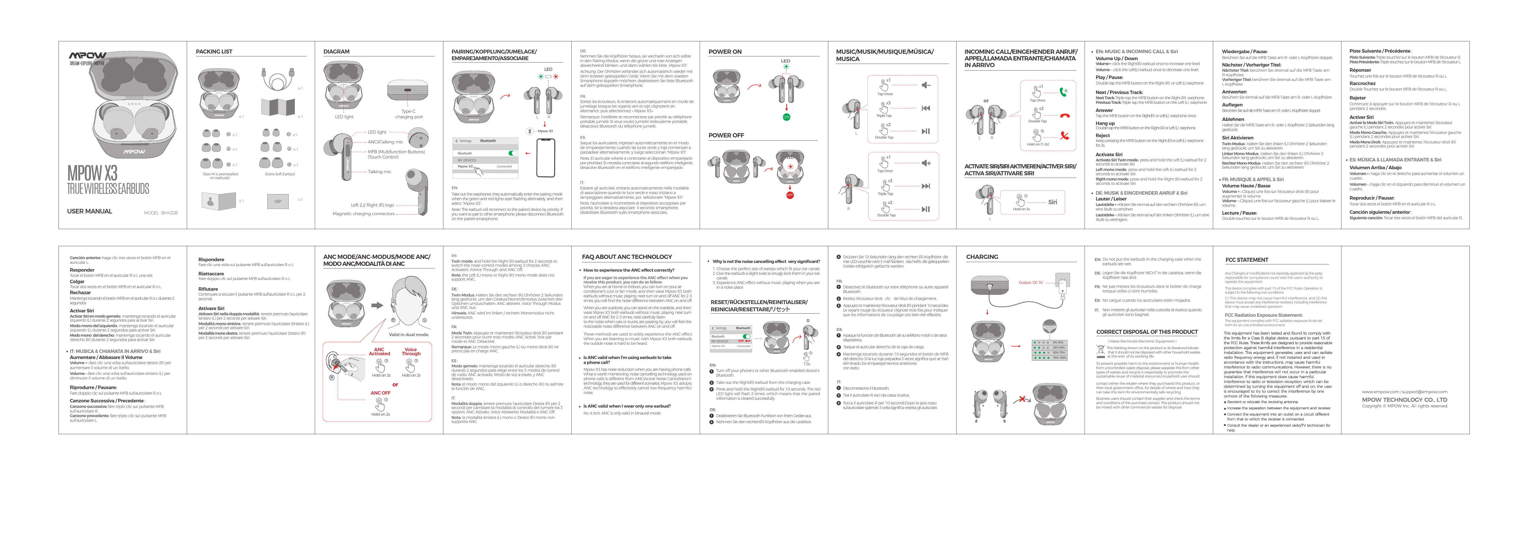 The Mpow X3 earbuds feature magnetic charging connectors (?), LED indicator lights (?), ANC/talking microphones (?), and multifunction buttons (?) for touch controls. Each earbud is marked with 'L' or 'R' logos.