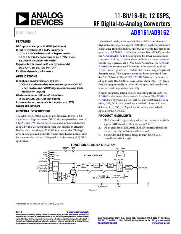 Data Sheet 11-Bit/16-Bit, 12 GSPS, RF Digital-to-Analog Converters AD9161/AD9162 FEATURES DAC update rate up to 12 GSPS (minimum) Direct RF synthesis at 6 GSPS (minimum) DC to 2.5 GHz in baseband 1× bypass mode DC to 6 GHz in 2× nonreturn-to-zero (NRZ) mode 1.5 GHz to 7.5 GHz in Mix-Mode Bypassable interpolation (1× or bypass mode) 2×, 3×, 4×, 6×, 8×, 12×, 16×, 24× Excellent dynamic performance APPLICATIONS Broadband communications systems DOCSIS 3.1 cable modem termination system (CMTS)/ video on demand (VOD)/edge quadrature amplitude modulation (EQAM) Wireless communications infrastructure W-CDMA, LTE, LTE-A, point to point Instrumentation, automatic test equipment (ATE) Radars and jammers GENERAL DESCRIPTION In baseband mode, wide bandwidth capability combines with high dynamic range to support DOCSIS 3.1 cable infrastructure compliance from the minimum of two carriers to full maximum spectrum of 1.794 GHz. A 2× interpolator filter (FIR85) enables the AD9161/AD9162 to be configured for lower data rates and converter clocking to reduce the overall system power and ease the filtering requirements. In Mix-ModeTM operation, the AD9161/ AD9162 can reconstruct RF carriers in the second and third Nyquist zones up to 7.5 GHz while still maintaining exceptional dynamic range. The output current can be programmed from 8 mA to 38.76 mA. The AD9161/AD9162 data interface consists of up to eight JESD204B serializer/deserializer (SERDES) lanes that are programmable in terms of lane speed and number of lanes to enable application flexibility. A serial peripheral interface (SPI) can configure the AD9161/ AD9162 and monitor the status of all registers. The AD9161/ AD9162 are offered in an 165-ball, 8.0 mm × 8.0 mm, 0.5 mm pitch, CSP_BGA package and in an 169-ball, 11 mm × 11 mm, 0.8 mm pitch, CSP_BGA package, including a leaded ball option for the AD9162. The AD9161/AD91621 are high performance, 11-bit/16-bit PRODUCT HIGHLIGHTS digital-to-analog converters (DACs) that supports data rates to 6 GSPS. The DAC core is based on a quad-switch architecture coupled with a 2× interpolator filter that enables an effective DAC update rate of up to 12 GSPS in some modes. The high dynamic range and bandwidth makes these DACs ideally suited for the most demanding high speed radio frequency (RF) DAC applications. 1. High dynamic range and signal reconstruction bandwidth supports RF signal synthesis of up to 7.5 GHz. 2. Up to eight lanes JESD204B SERDES interface flexible in terms of number of lanes and lane speed. 3. Bandwidth and dynamic range to meet DOCSIS 3.1 compliance with margin. FUNCTIONAL BLOCK DIAGRAM RESET IRQ ISET VREF SDIO SDO CS SCLK SERDIN0± SERDIN7± SYNCOUT± SYSREF± SPI JESD HB 2× HB 3× AD9161/AD9162 HB 2× NCO VREF NRZ RZ MIX INV SINC DAC CORE OUTPUT± HB TO JESD CLOCK 2×, TO DATAPATH DISTRIBUTION 4×, 8× DATA LATCH 14379-001 TX_ENABLE Figure 1. CLK± 1 Protected by U.S. Patents 6,842,132 and 7,796,971. Rev. D Document Feedback Information furnished by Analog Devices is believed to be accurate and reliable. However, no responsibility is assumed by Analog Devices for its use, nor for any infringements of patents or other rights of third parties that may result from its use. Specifications subject to change without notice. No license is granted by implication or otherwise under any patent or patent rights of Analog Devices. Trademarks and registered trademarks are the property of their respective owners. One Technology Way, P.O. Box 9106, Norwood, MA 02062-9106, U.S.A. Tel: 781.329.4700 ©20162019 Analog Devices, Inc. All rights reserved. Technical Support www.analog.com AD9161/AD9162 TABLE OF CONTENTS Features .............................................................................................. 1 Applications....................................................................................... 1 General Description ......................................................................... 1 Product Highlights ........................................................................... 1 Functional Block Diagram .............................................................. 1 Revision History ............................................................................... 3 Specifications..................................................................................... 4 DC Specifications ......................................................................... 4 DAC Input Clock Overclocking Specifications........................ 5 Power Supply DC Specifications ................................................ 5 Serial Port and CMOS Pin Specifications ................................. 8 JESD204B Serial Interface Speed Specifications ...................... 9 SYSREF± to DAC Clock Timing Specifications....................... 9 Digital Input Data Timing Specifications ............................... 10 JESD204B Interface Electrical Specifications ......................... 10 AC Specifications........................................................................ 11 Absolute Maximum Ratings.......................................................... 13 Reflow Profile.............................................................................. 13 Thermal Management ............................................................... 13 Thermal Resistance .................................................................... 13 ESD Caution................................................................................ 13 Pin Configurations and Function Descriptions ......................... 14 Typical Performance Characteristics ........................................... 18 AD9161 ........................................................................................ 18 AD9162 ........................................................................................ 28 Terminology .................................................................................... 42 Theory of Opera