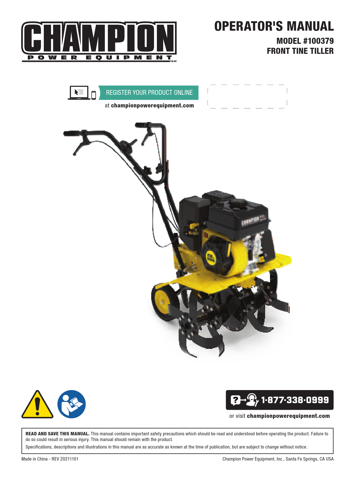 User Manual for CHAMPION models including: 100379, Front Tine Tiller