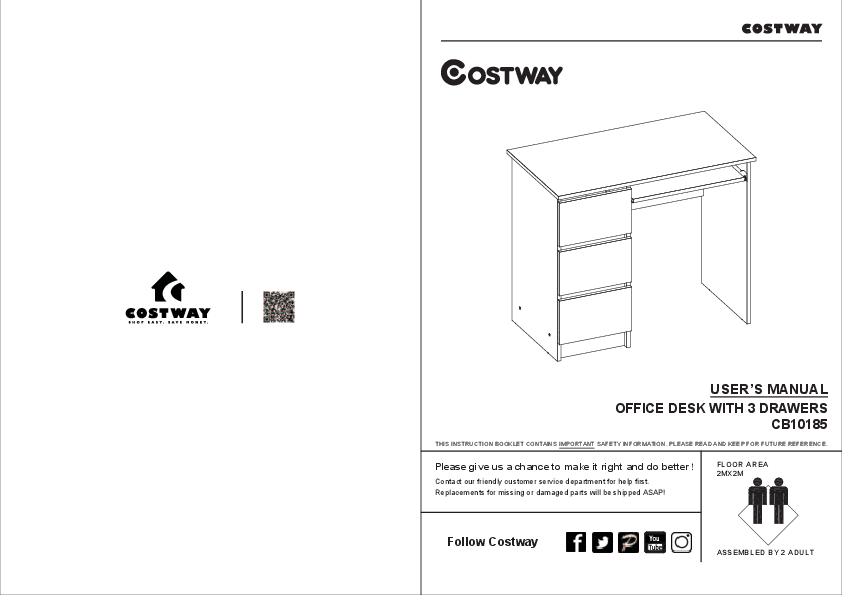 User Manual for COSTWAY models including: CB10185, Office Desk with 3 Drawers
