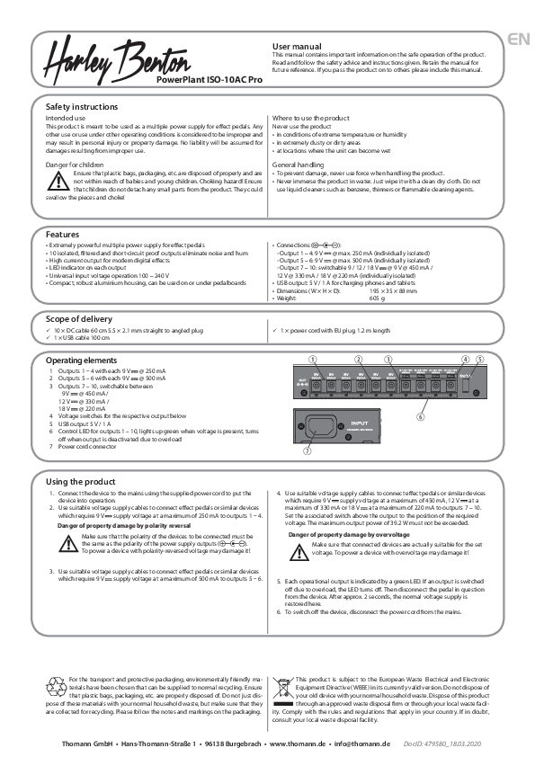 This product is designed as a multiple power supply for effect pedals. Any other use or use under different operating conditions is considered improper and may lead to personal injury or property damage. No liability will be assumed for damages resulting from improper use.