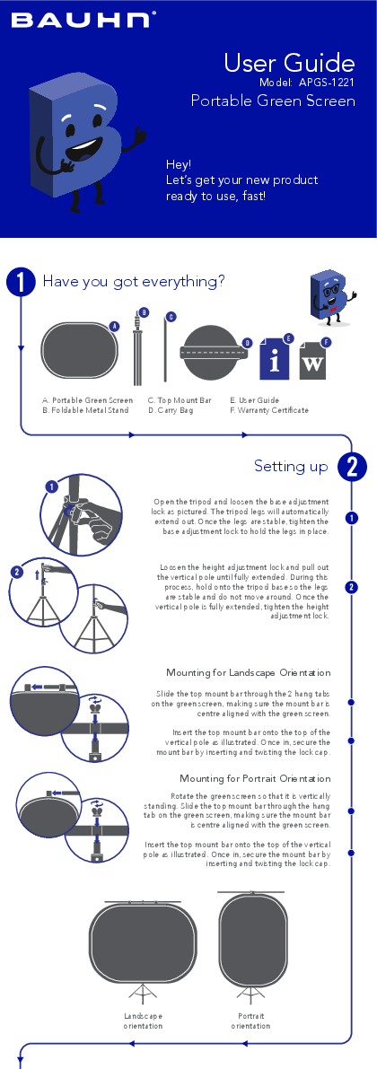 User Guide Model: APGS-1221 Portable Green Screen Hey! Let's get your new product ready to use, fast! Have you got everything? B C A D E F A. Portable Green Screen C. Top Mount Bar B. Foldable Metal Stand D. Carry Bag E. User Guide F. Warranty Certificate Setting up Open the tripod and loosen the base adjustment lock as pictured. The tripod legs will automatically extend out. Once the legs are stable, tighten the base adjustment lock to hold the legs in place. Loosen the height adjustment lock and pull out the vertical pole until fully extended. During this process, hold onto the tripod base so the legs are stable and do not move around. Once the vertical pole is fully extended, tighten the height adjustment lock. Mounting for Landscape Orientation Slide the top mount bar through the 2 hang tabs on the green screen, making sure the mount bar is centre aligned with the green screen. Insert the top mount bar onto the top of the vertical pole as illustrated. Once in, secure the mount bar by inserting and twisting the lock cap. Mounting for Portrait Orientation Rotate the green screen so that it is vertically standing. Slide the top mount bar through the hang tab on the green screen, making sure the mount bar is centre aligned with the green screen. Insert the top mount bar onto the top of the vertical pole as illustrated. Once in, secure the mount bar by inserting and twisting the lock cap. Landscape orientation Portrait orientation Packing the green screen The green screen comes with a carry bag to pack into, so you can take it anywhere you go. Holding the top, grab the bottom and fold together. Fold the remaining two outer sides inwards. 3 Flip over and pull the back side towards your body. 4 Adjust the edges to form a circle 3 4 and store it inside the carry bag. Ask for a hand! With the green screen being large, having another person to help will make the process easier. Troubleshooting Wrinkles on background · Spray the green screen with water and stretch it out tight as it dries to reduce the wrinkles and lines. Dirt marks and debris on background · Clean your green screen using only mild soap and water; do not use cleaning solutions. Large shadows on background · Appropriately distance between the person/model and the green screen. Trial with the background lighting and person/model until no dark shadows on the green screen are visible. · Remove the wrinkles as this may create shadows on the background. Specifications Green Screen Size Net Weight 200 x 150 cm 2.8kg Give us a call What? You mean this User Guide didn't have ALL the answers? Speak to us! We'd love to help you get up and running as quickly as possible. Call our After Sales Support on 1300 002 534. Operating hours: Monday-Friday, 8:30am-6pm Saturday, 9am-6pm AEST Enjoy using your new product! Well done, you made it. Now sit back and relax... your new product is automatically covered by a 1-year warranty. How nice!Adobe PDF Library 15.0 Adobe InDesign 16.3 (Windows)