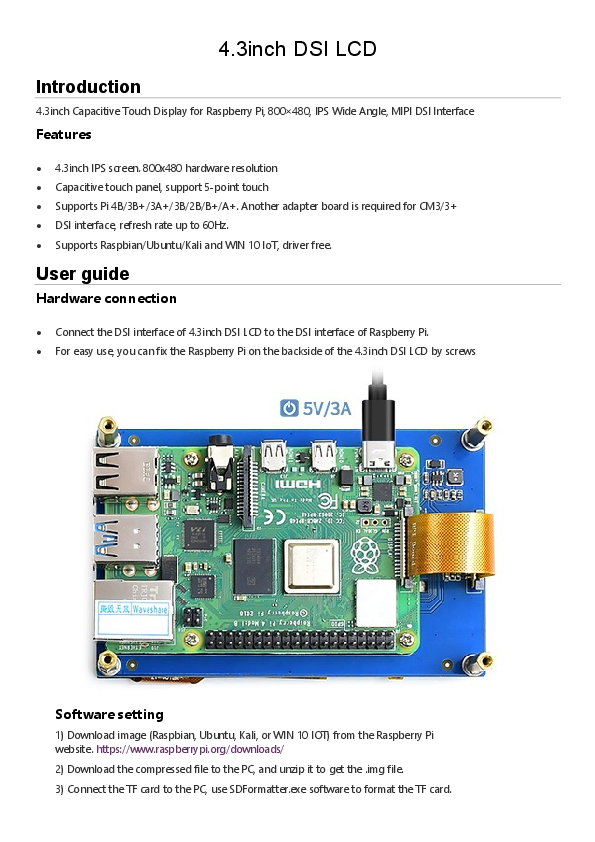 · 4.3inch IPS screen. 800x480 hardware resolution · Capacitive touch panel, support 5-point touch · Supports Pi 4B/3B+/3A+/3B/2B/B+/A+. Another adapter board is required for CM3/3+ · DSI interface, refresh rate up to 60Hz. · Supports Raspbian/Ubuntu/Kali and WIN 10 IoT, driver free.