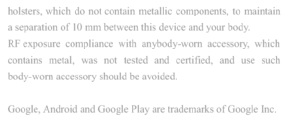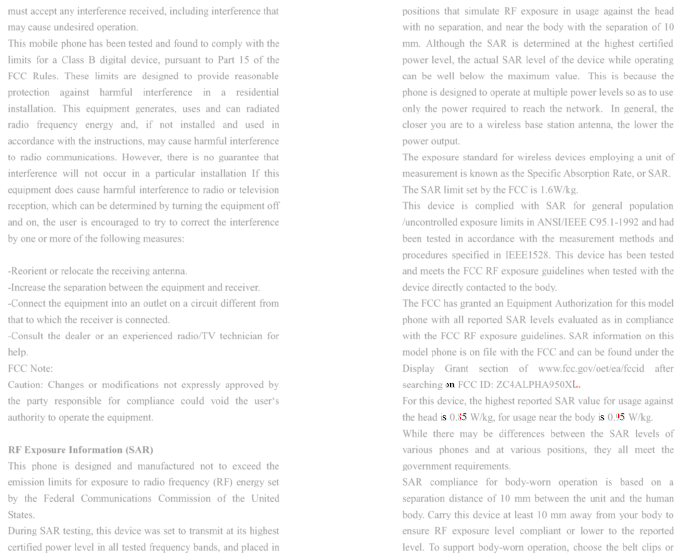 the head is 0.85 W/kg, for usage near the body is 0.95 W/kg.