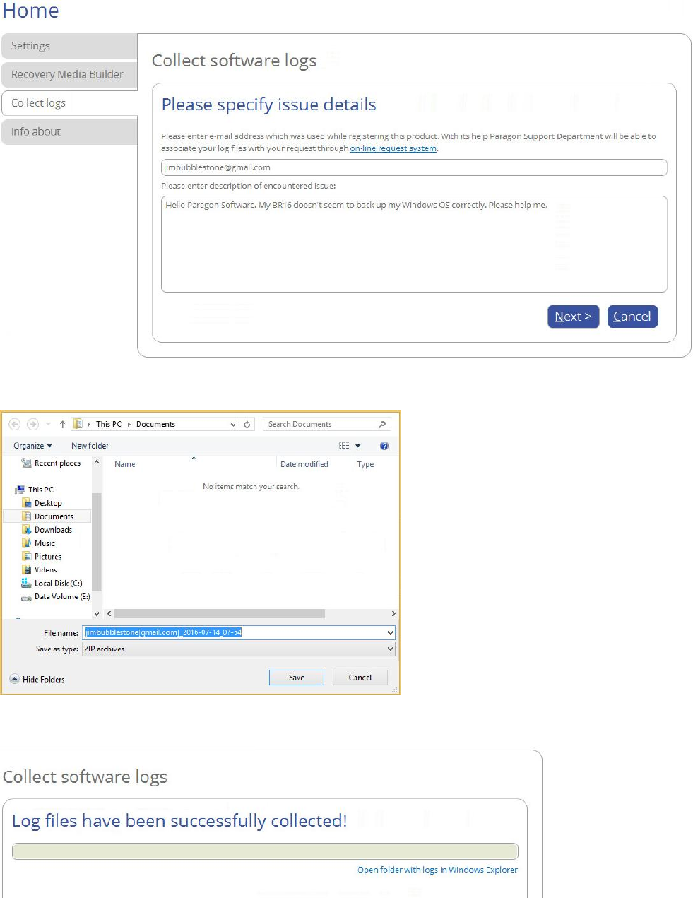1. Select Home > Collect logs. Provide an e-mail address used for registering the product, then describe the