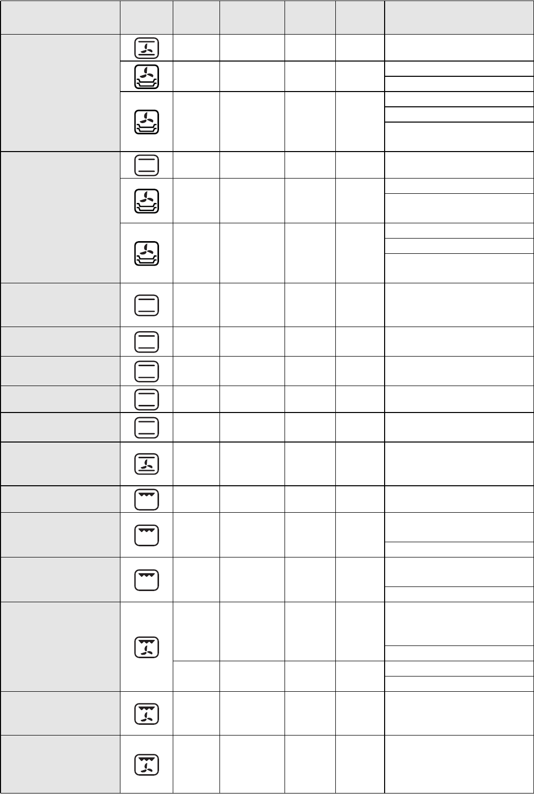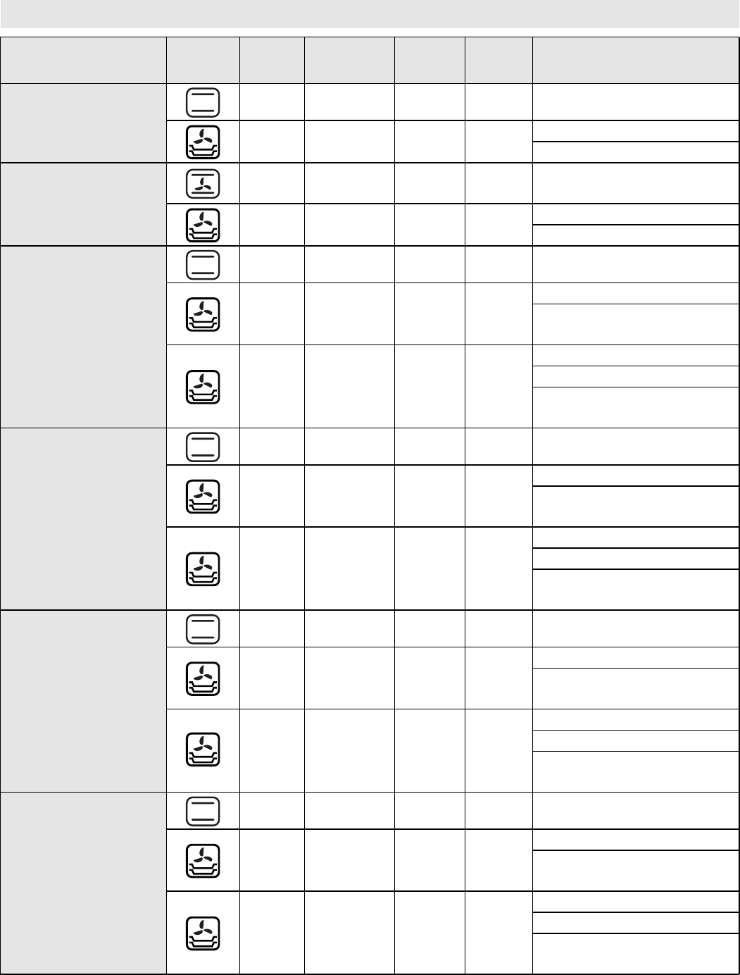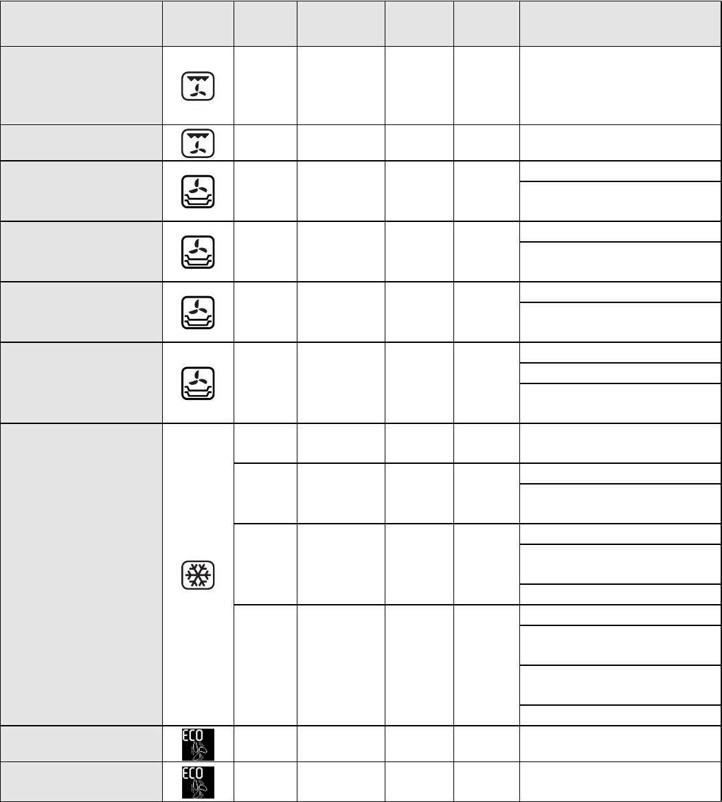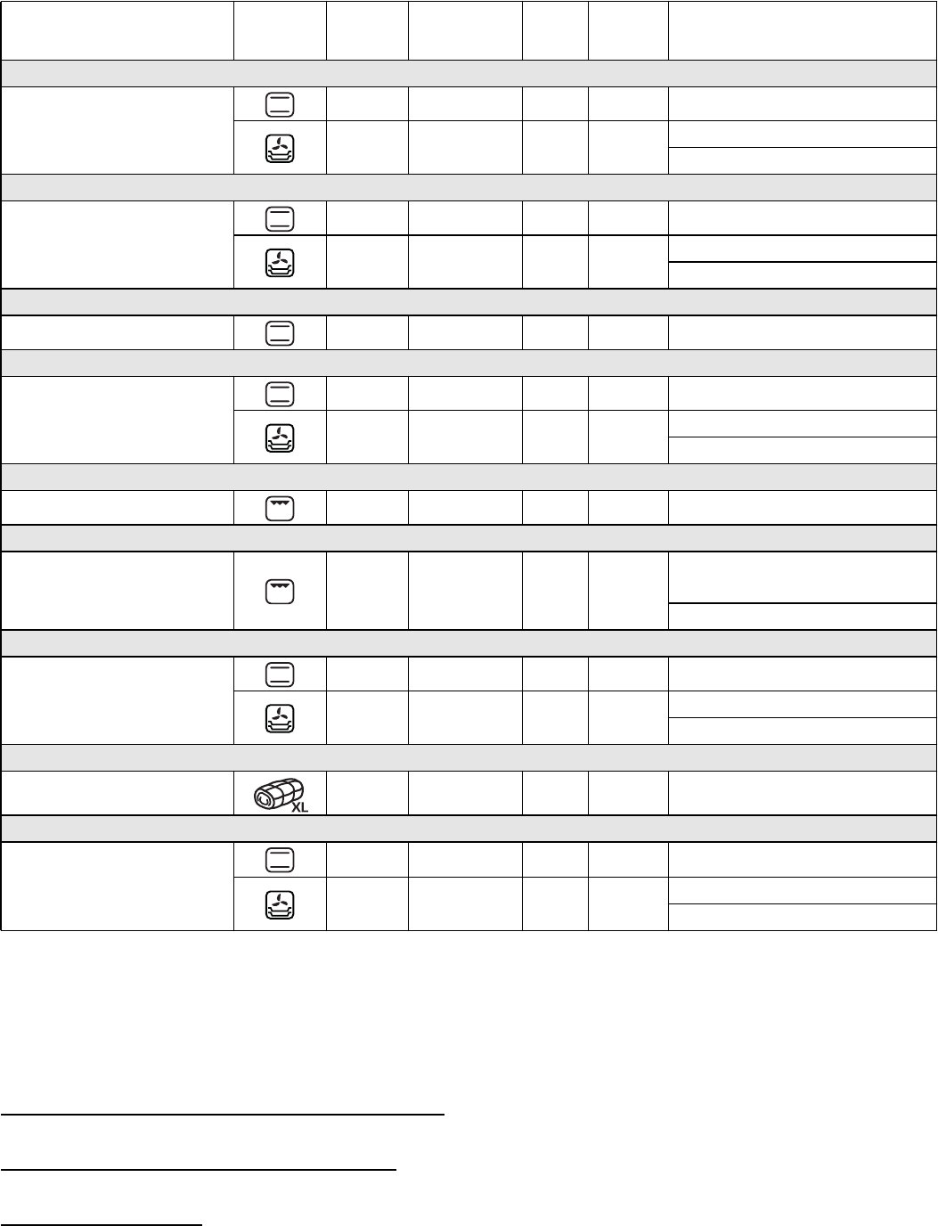 The table indicates the best function to use for any given food, to be cooked on one or more shelves at the