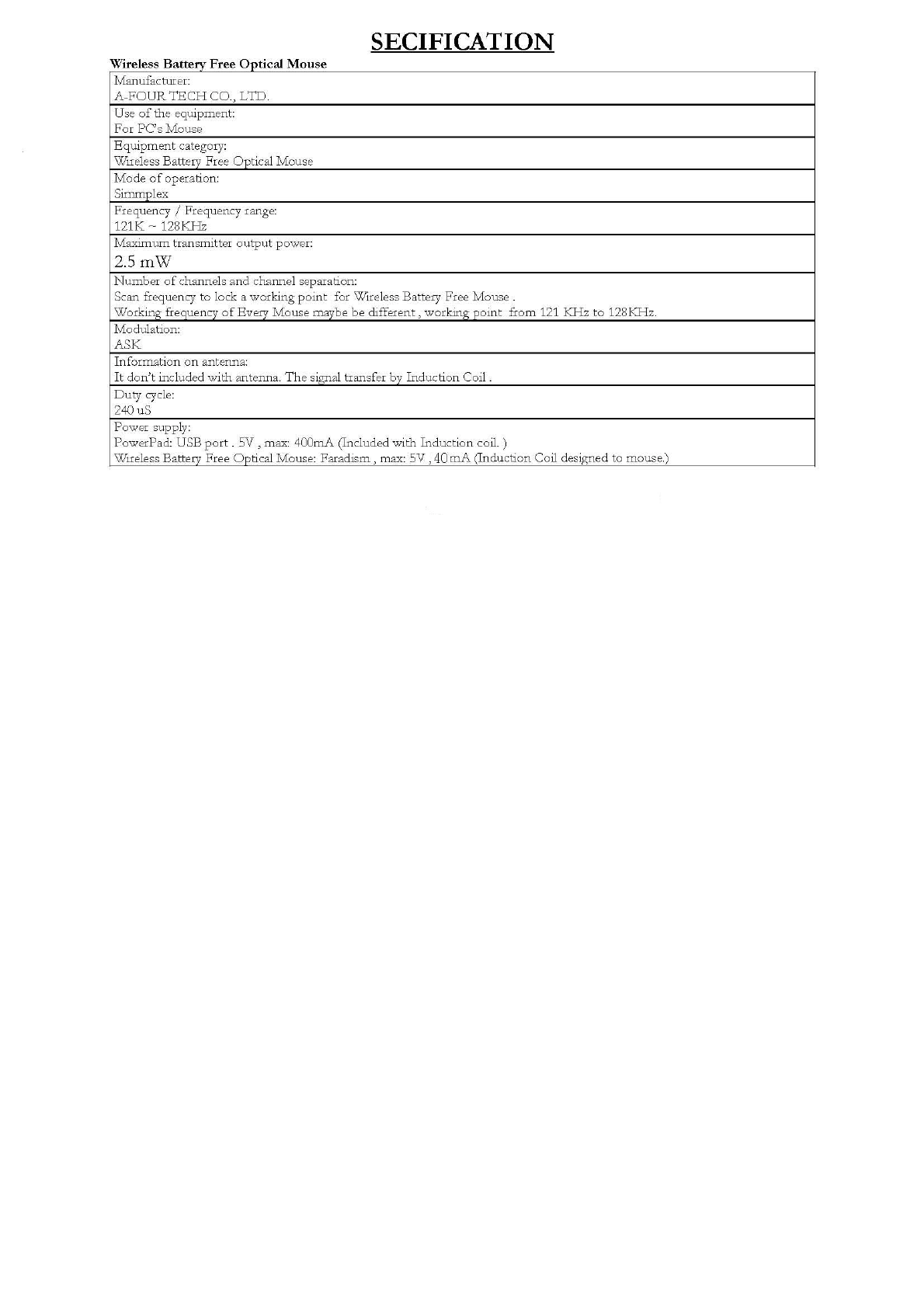 A Four Tech Co NB53A1 Wireless Battery Free Optical Mouse User Manual NB Spec