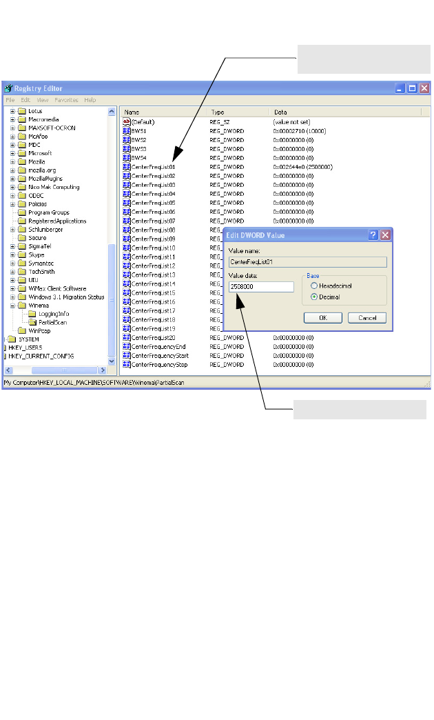 4. Add the center frequencies you want to scan to the following registry entries: