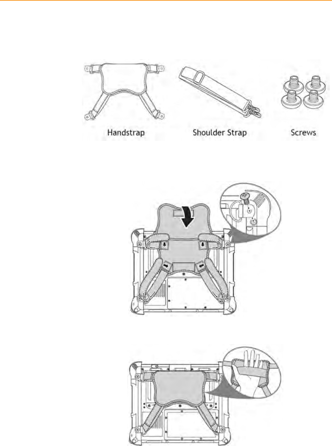 Attach the handstrap to the rear of your tablet PC using the four screws. Then