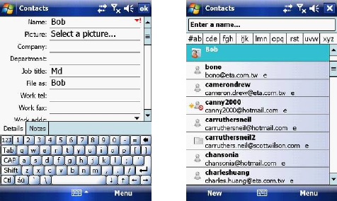 a contact from Call History or from the message by tapping Menu > Save to Contacts.