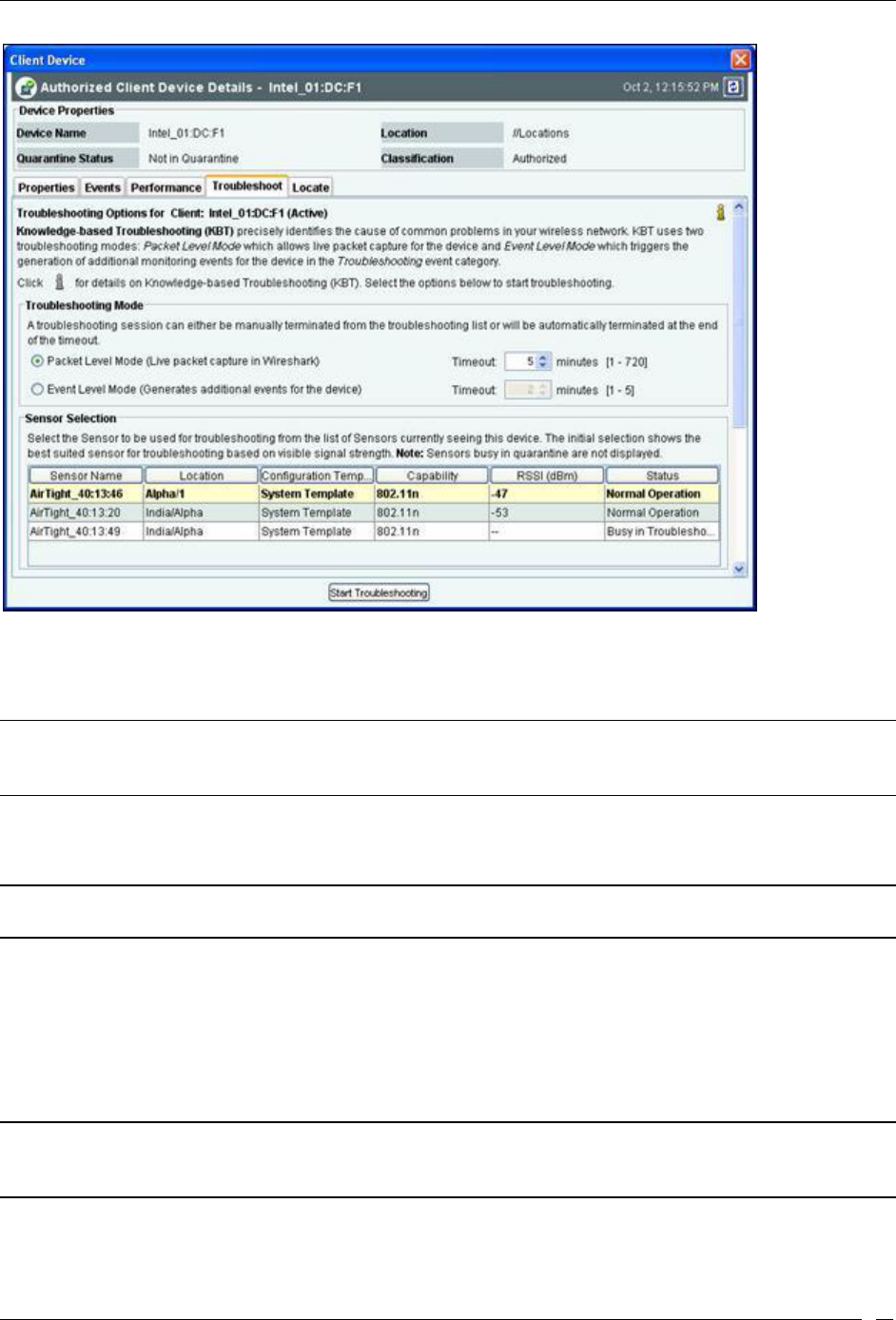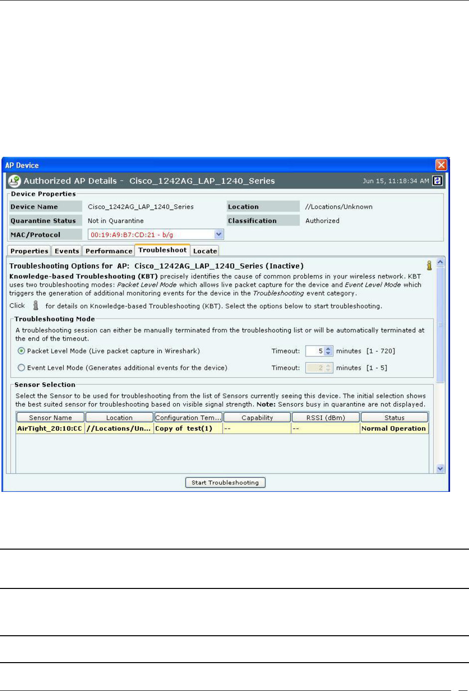Start Troubleshooting: Opens the Troubleshoot tab of the AP Device dialog, which allows you to