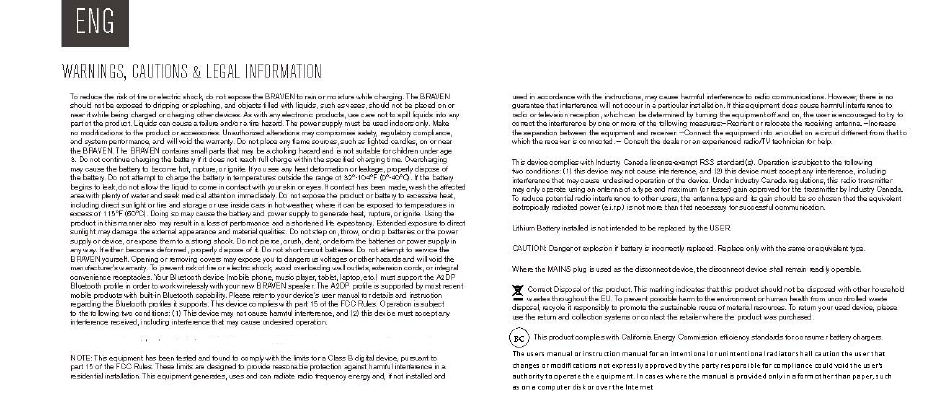 déformée, l’éliminer adéquatement. Ne pas court-circuiter les batteries. Ne pas essayer de réparer l’enceinte BRAVEN soi-