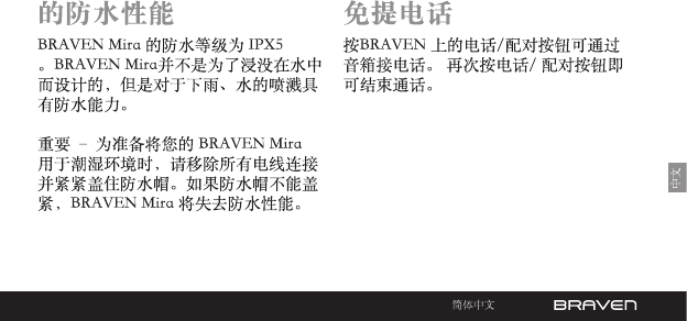 • The BRAVEN Mira is IPX5 Water Resistant.