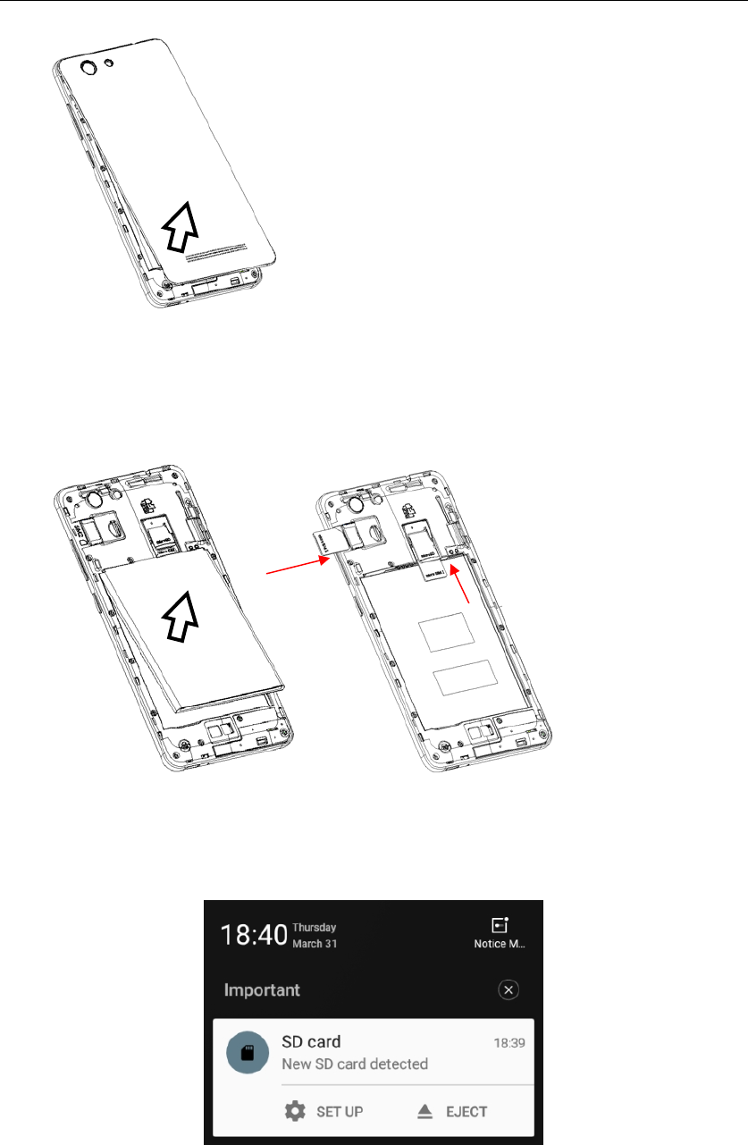 2. Remove the battery and insert the Micro SIM and SD cards to the card slots correctly.