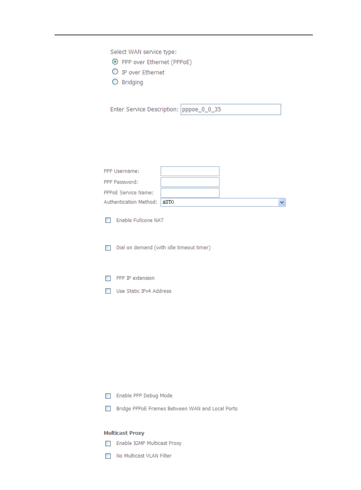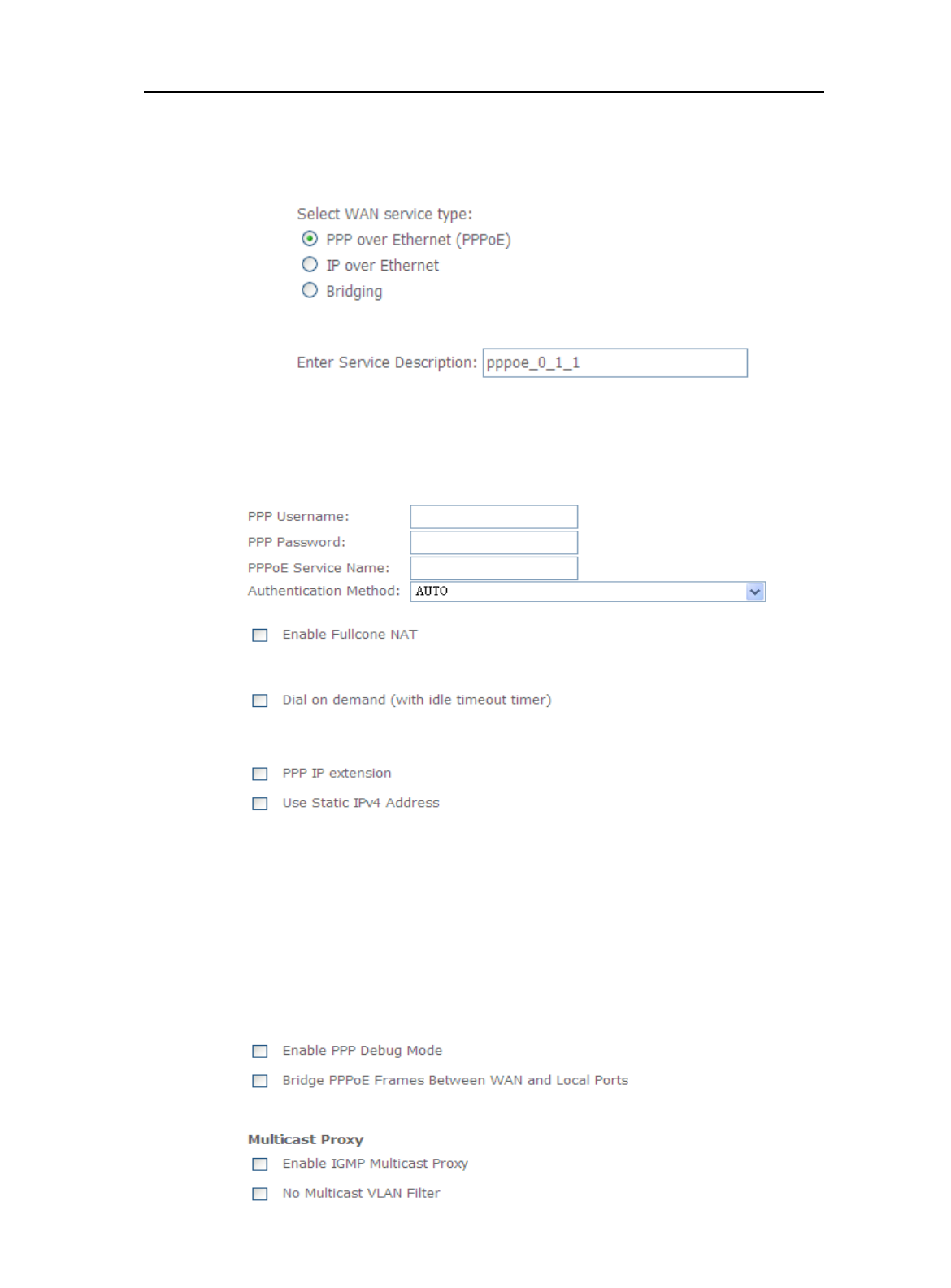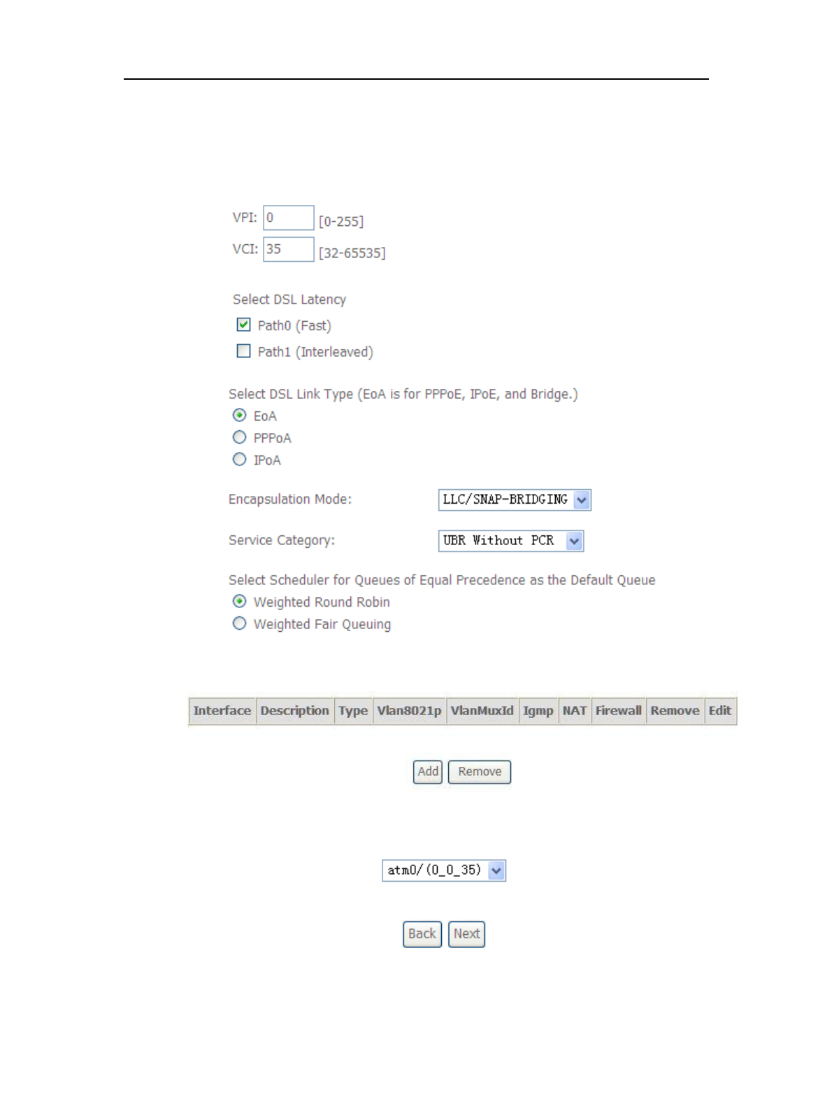 VPI, VCI, type of encapsulation and type of multiplexing setting are the same as