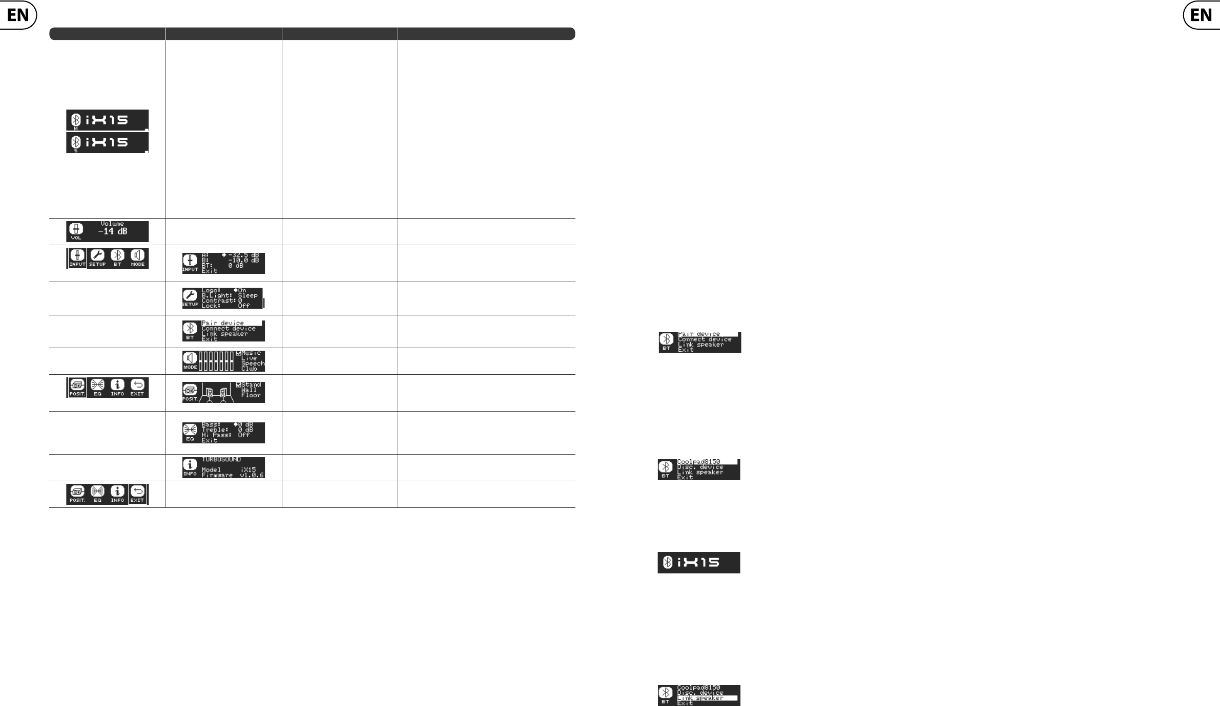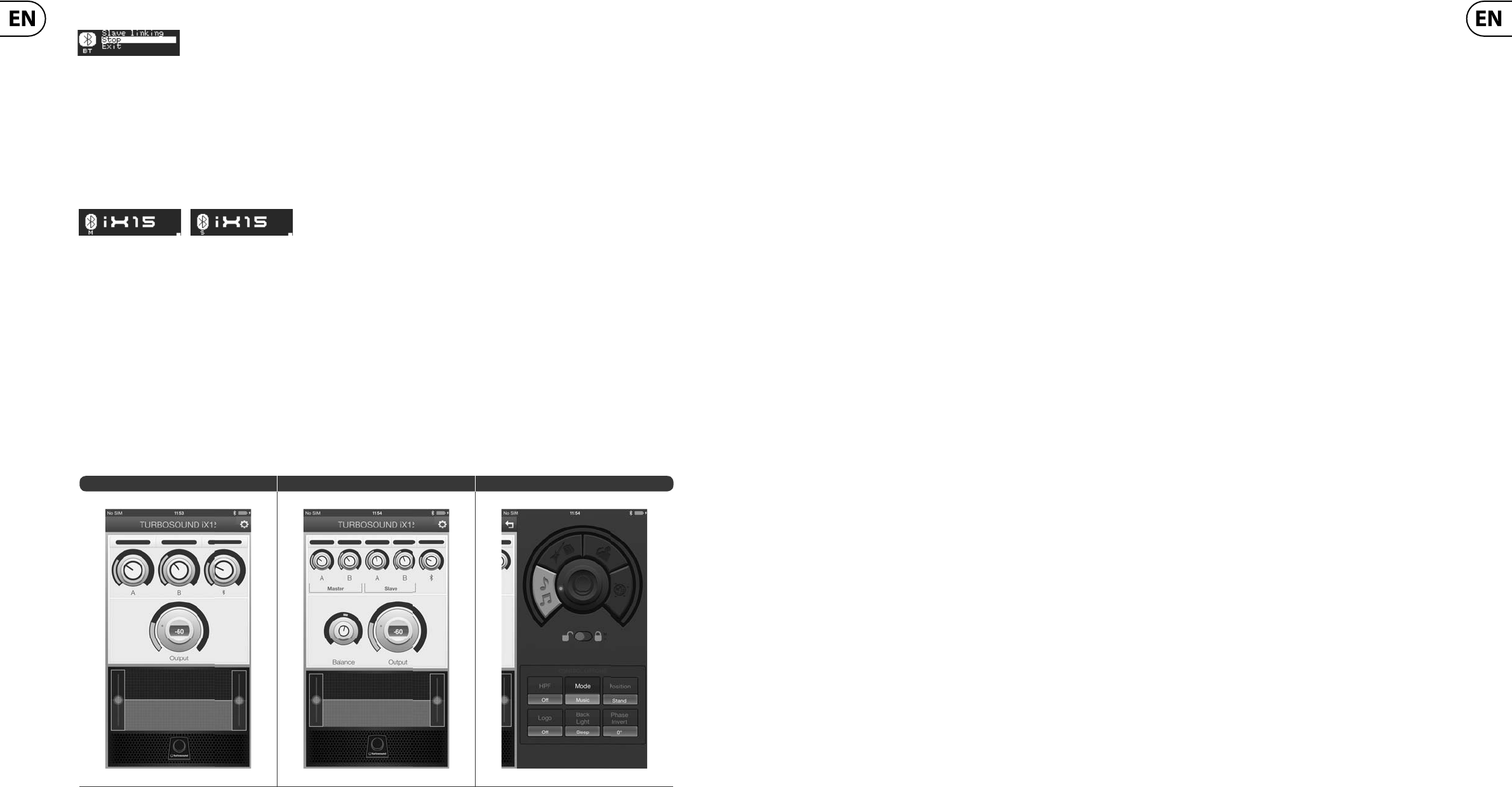 Main Page (1 speaker) Main Page (2 speakers linked) Settings/EQ Page