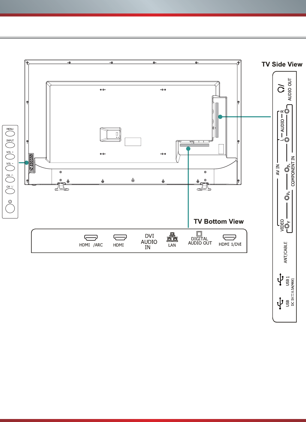 HDMI ports, USB portV, LAN port for Ethernet, 1 Digital Audio output, 1 RF in-put,