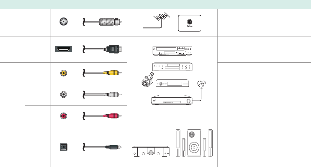 HDMI and other types of cables (not included) to connect external devices to the TV