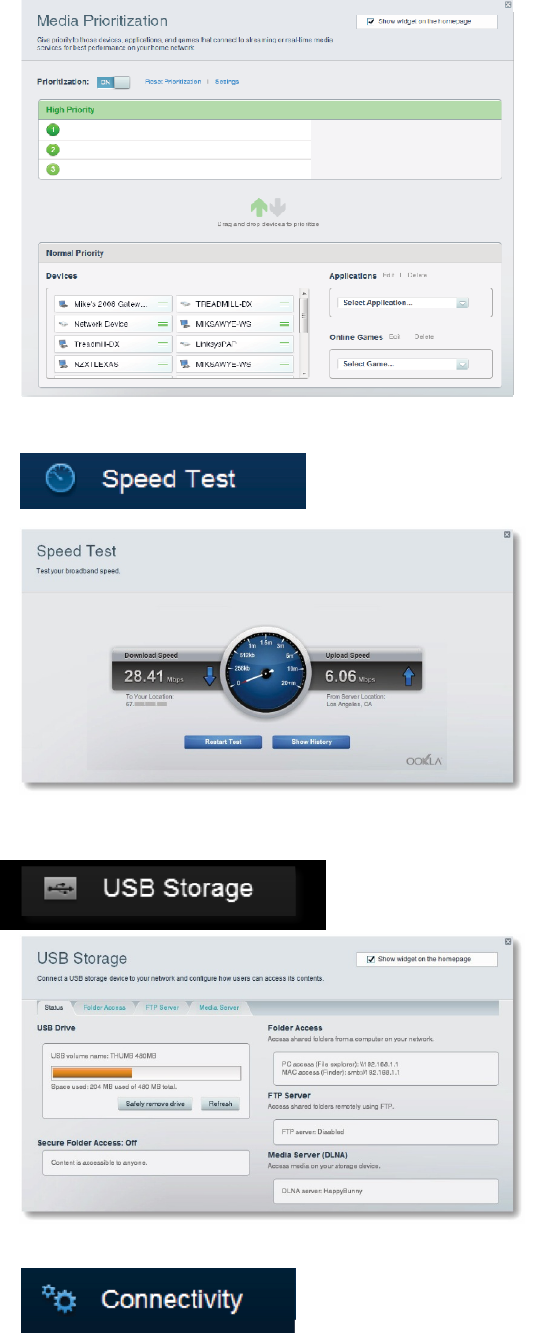 USB Storage lets you access an attached USB drive (not included) and set up file sharing, a media server, and FTP access.
