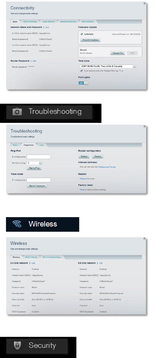 Troubleshooting lets you diagnose problems with your router and check the status of the network.