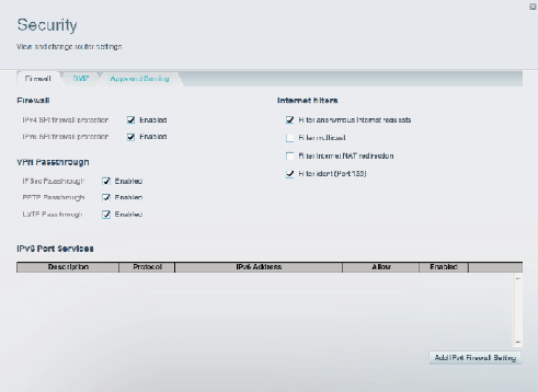Security lets you configure your router’s wireless security. You can set up the firewall, VPN settings, and make custom settings