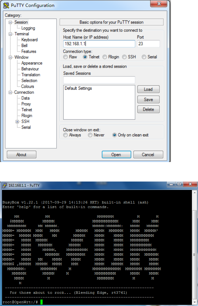 2) Wait2minutes,usetelnettool(e.g.putty.exe)loginto192.168.1.1;