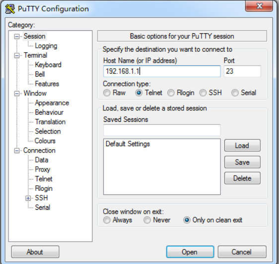 2) Wait2minutes,usetelnettool(e.g.putty.exe)loginto192.168.1.1;