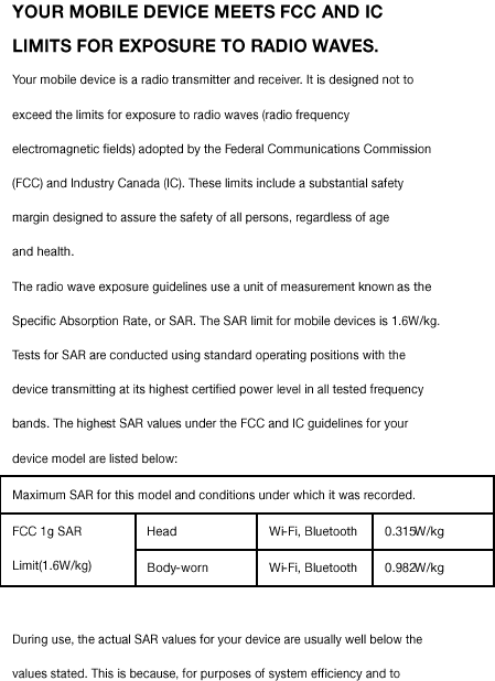 Absorption Rate, or SAR. The SAR limit for mobile devices is 2W/kg. Tests for SAR are