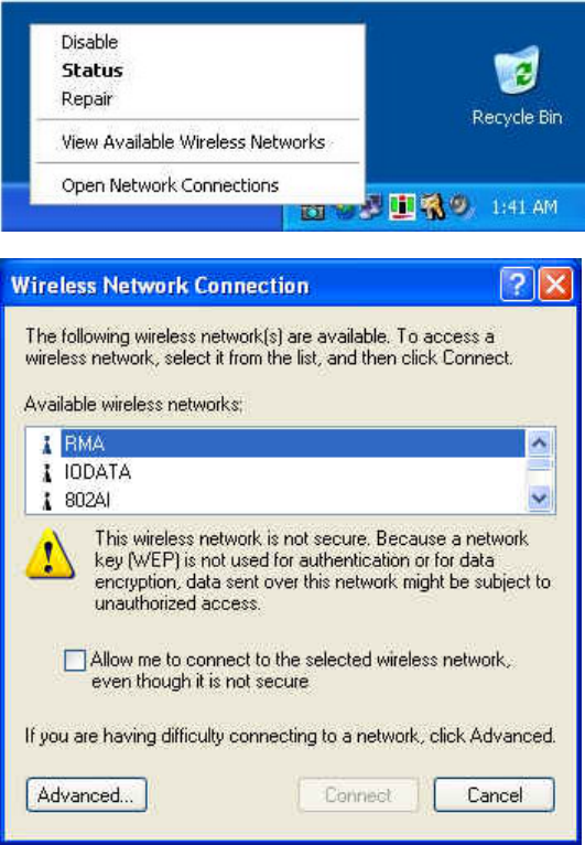 Network Connection icon on the System Tray and select View Available Wireless Networks to connect to the