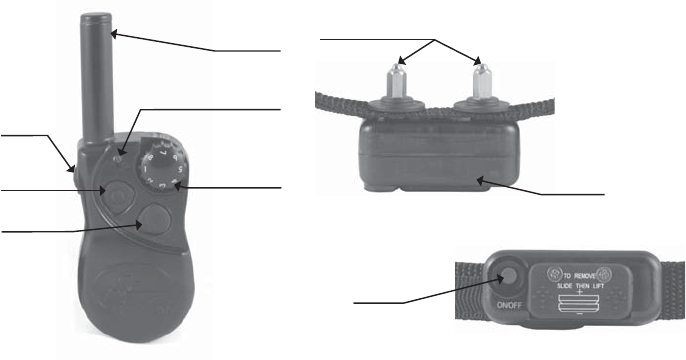 Collar Receiver: Receives the radio signal from the Remote Transmitter. It is waterproof and can be